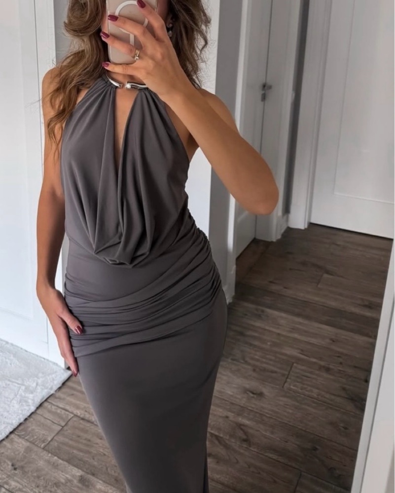 elegant maxi dress, sophisticated halter neckline and ruched detailing for a flattering, figure-hugging fit. Perfect for dinner, date or a night out!