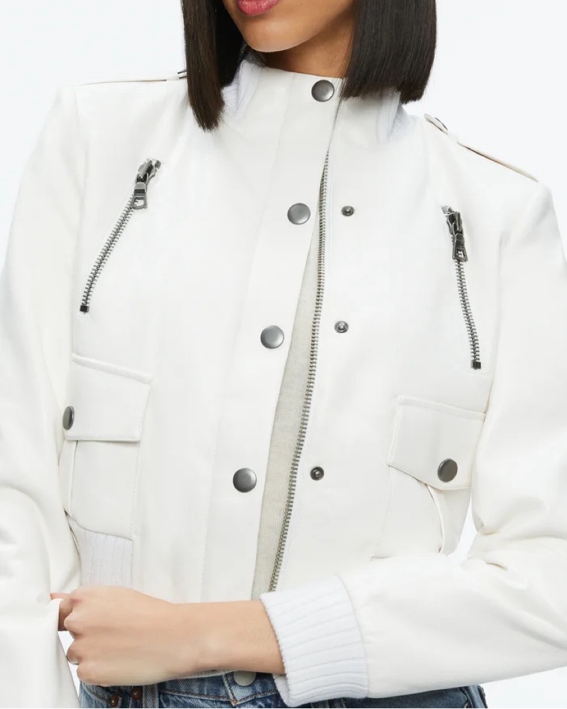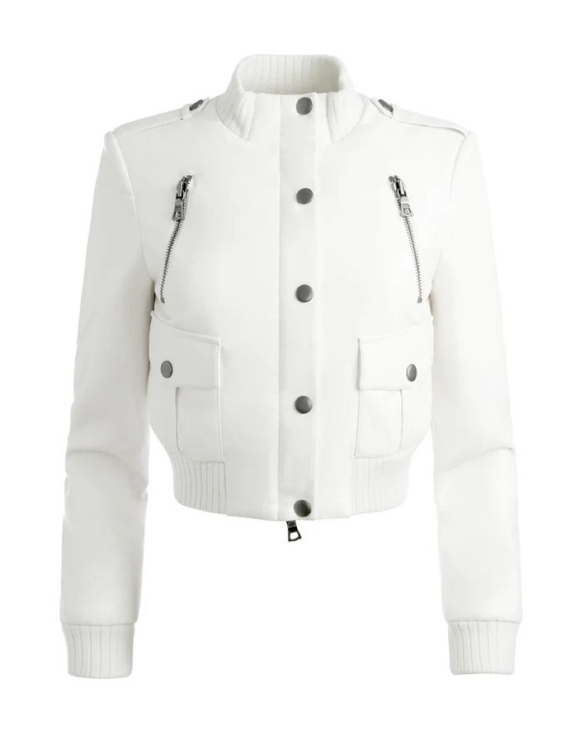 Vegan white leather cropped long sleeve moto jacket