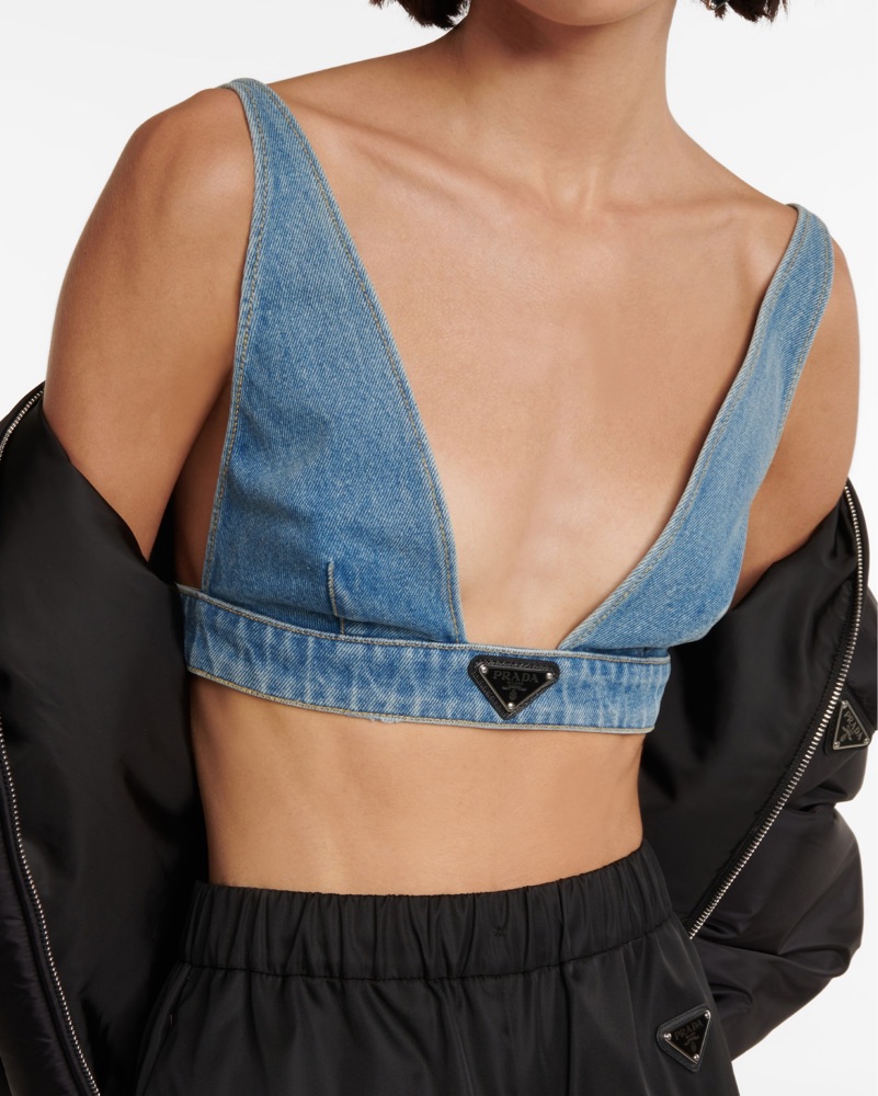 Prada has a thing for layering this season, and this versatile bralette is the perfect foundation for your looks. Cut from organic-cotton denim in a light-blue wash, it features a flattering deep plunge neck and the label's tringle logo at the front. Size 38.