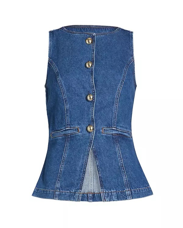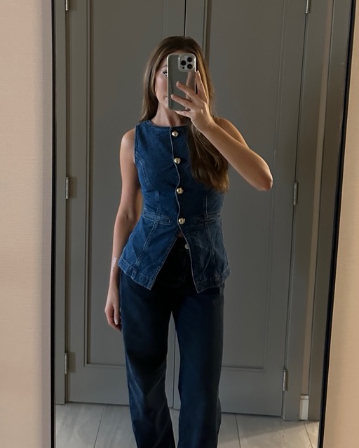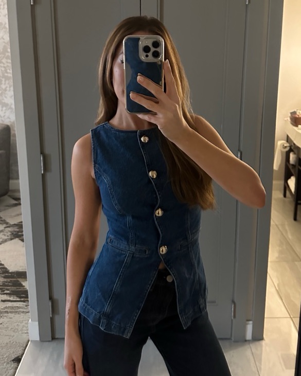 Reformation denim vest top with big silver buttons. So flattering and fun!