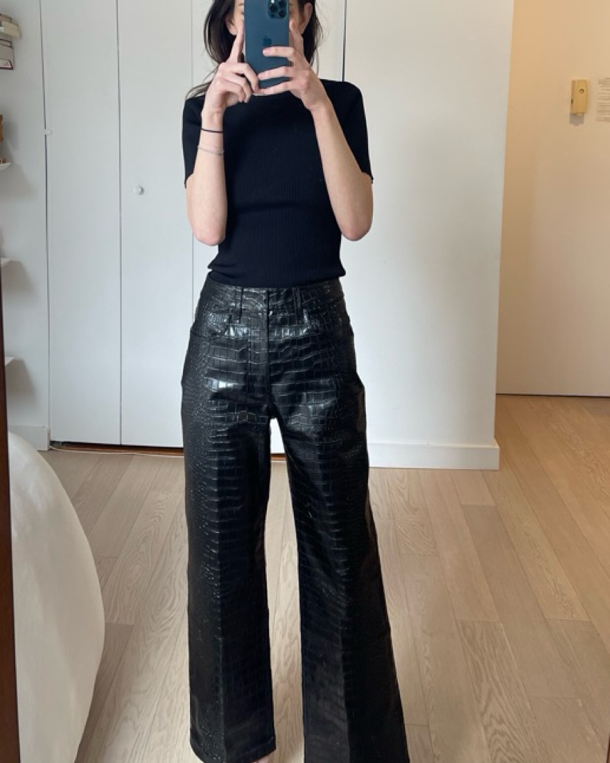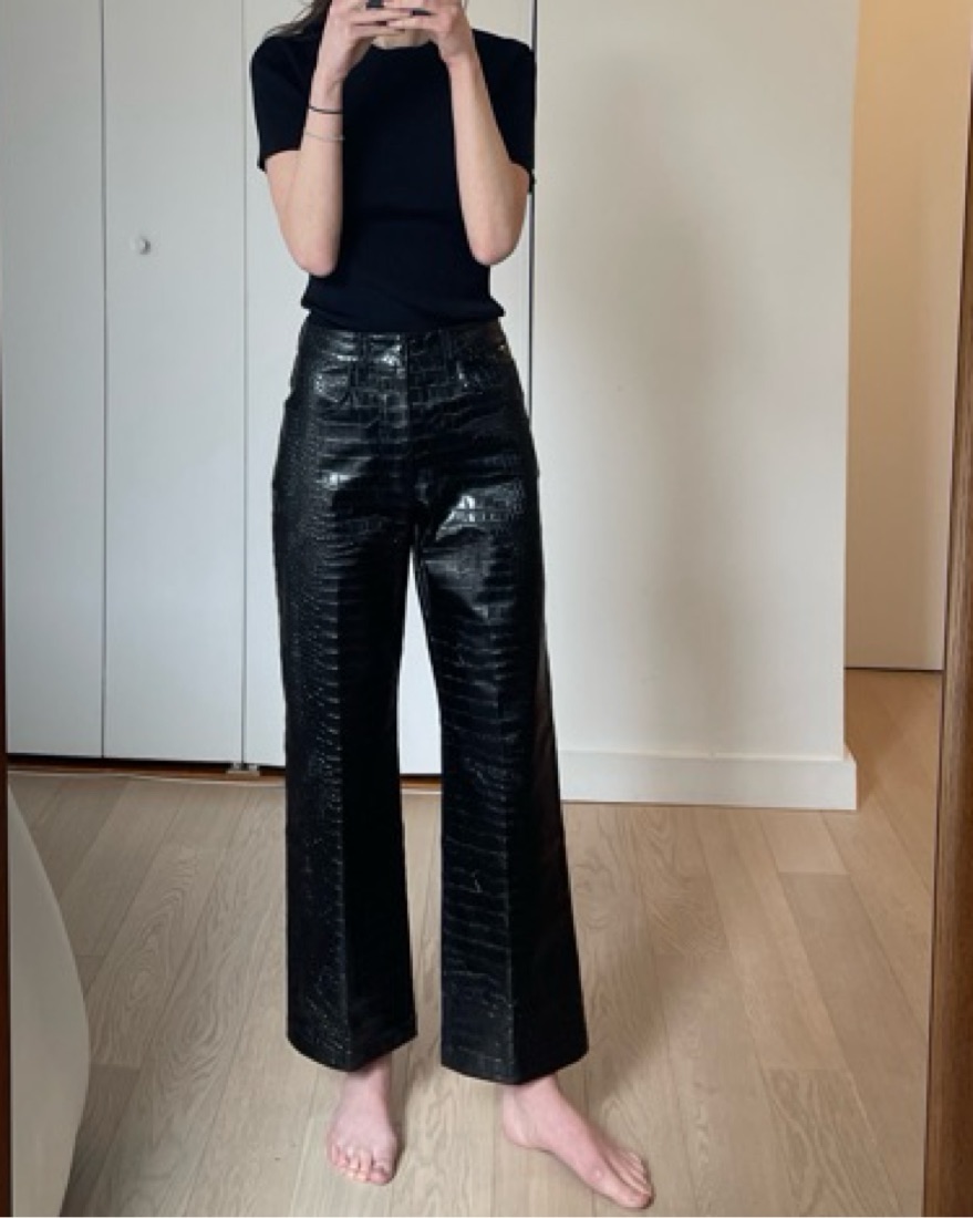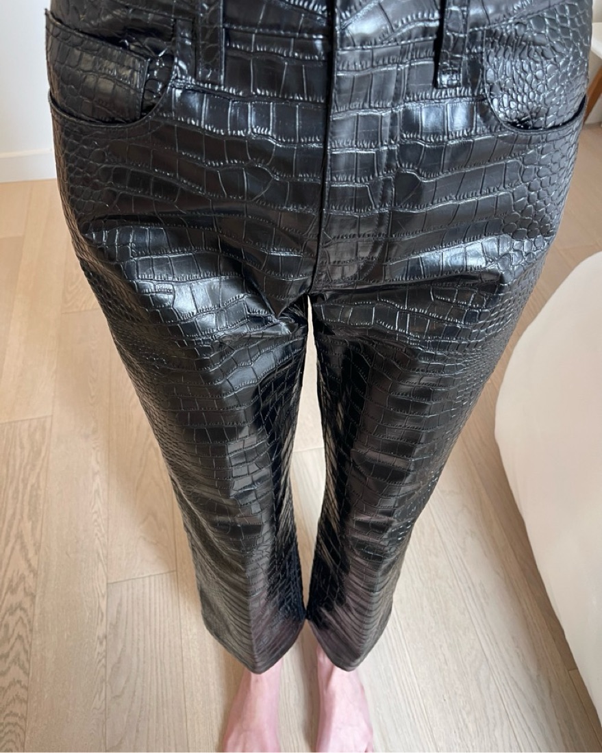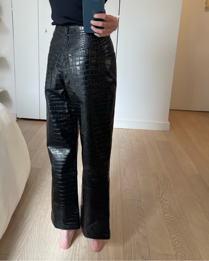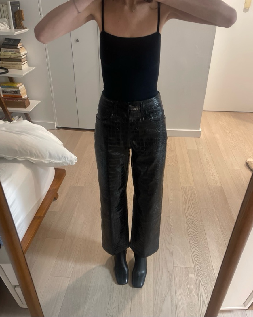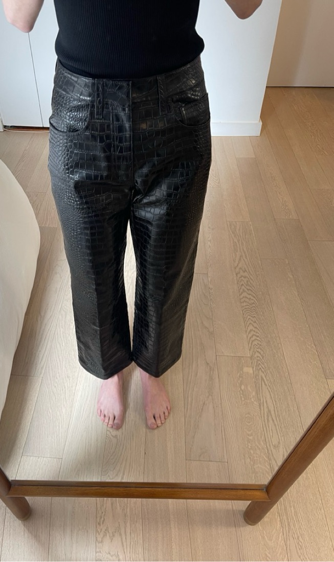 Black “Bonnie croc-effect pants” in excellent condition, size XS. Fits a true 0. Pants are stiff/structured and mid weight, felt weird at first putting them on but I was not at all uncomfortable wearing them or sitting in them. Really fun for a night out.