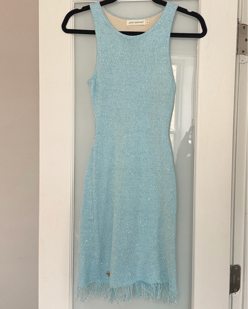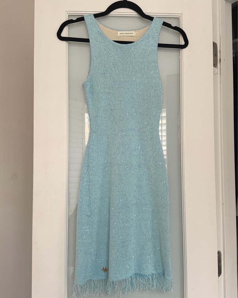 This stunning aqua fringe dress from Asta Resort is perfect for a Bach, beach vacation or GNO. blue knit lined with sequins and short fringe
