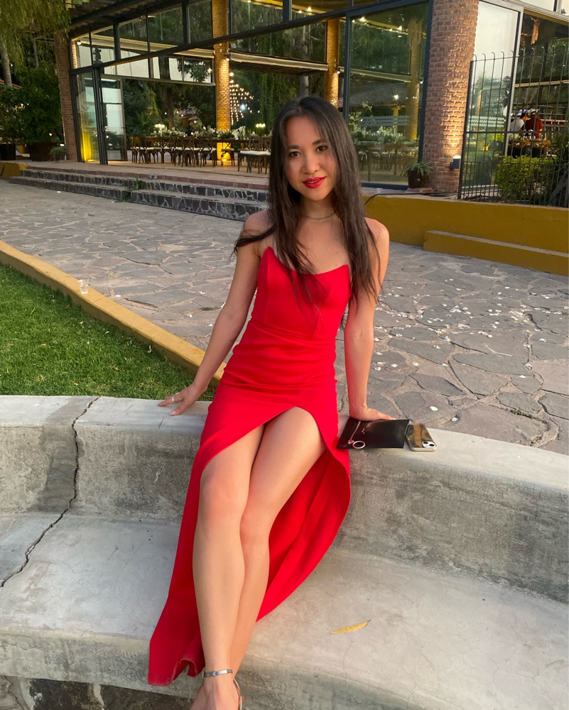 This stunning red gown exudes glamour and confidence. The alluring slit adds a touch of drama, making it perfect for a formal event or red carpet affair.
