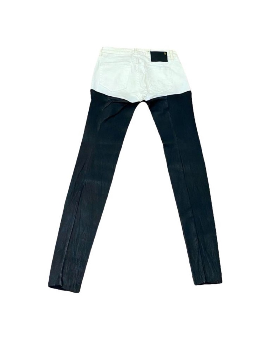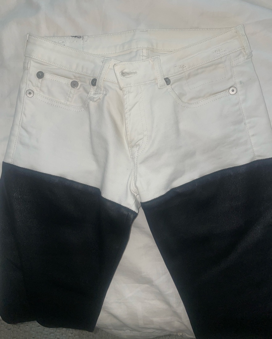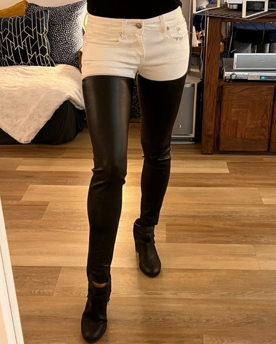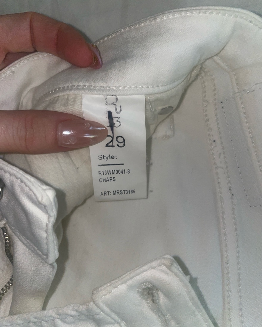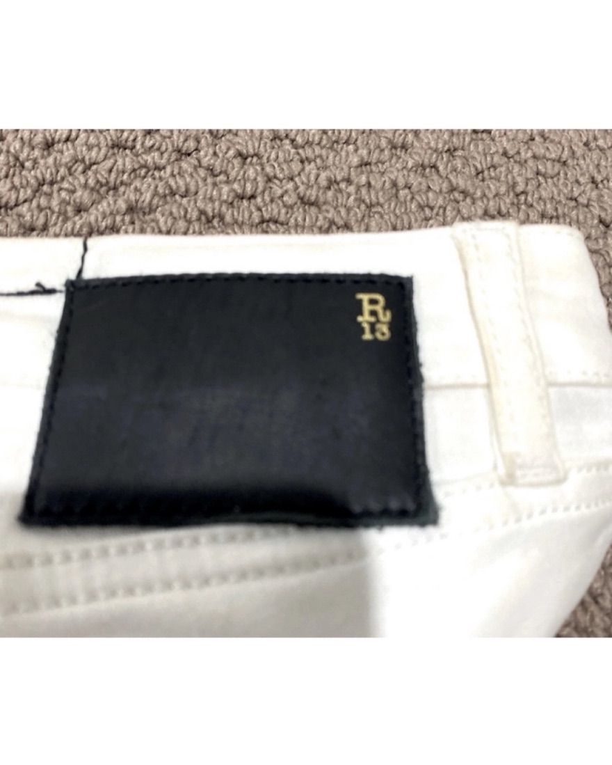 R13's signature chaps-style skinny jeans, fashioned in white denim and finished with soft leather legs. 5-pocket styling keeps this pair classic, and cotton backing offers comfortable wear. Size 29 will fit a 6/8/10. The rise is fairly low.
