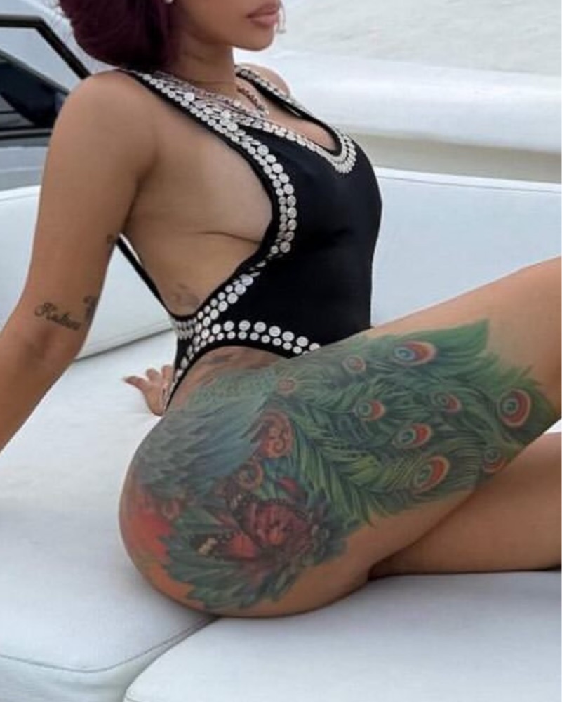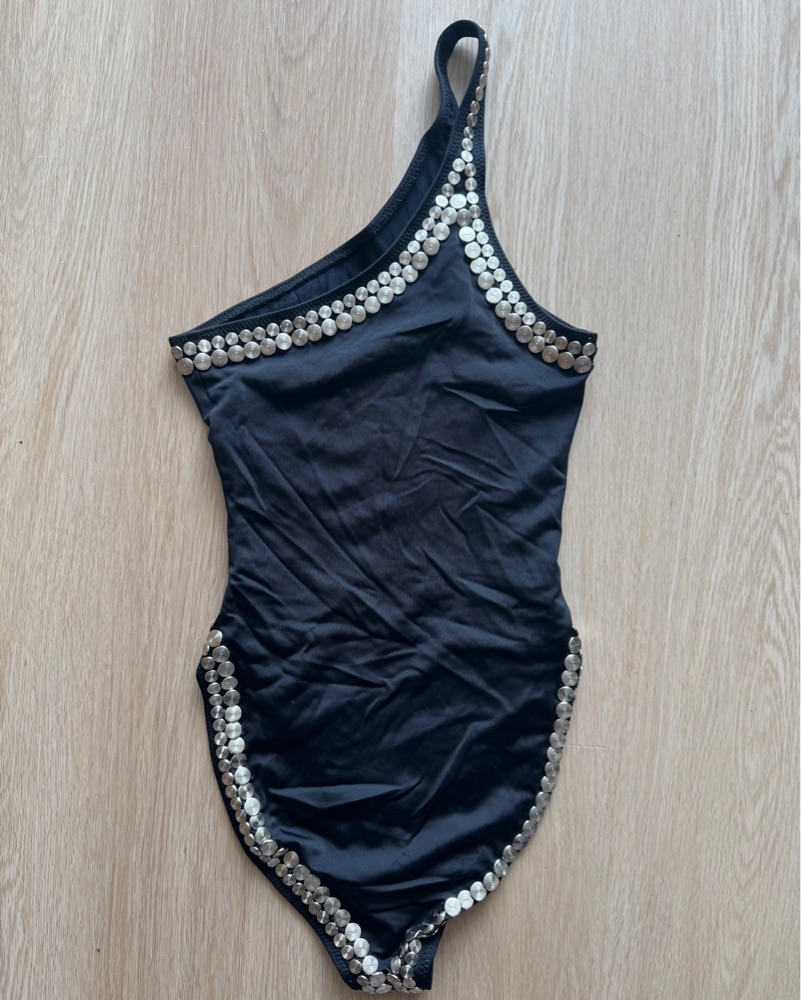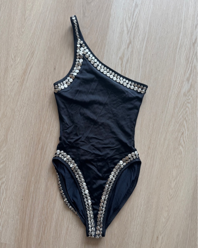 The pinnacle of glamorous swimwear. This silver-studded, one shoulder design is cut high on the the leg and has moderate seat coverage. The versatility of this suit goes way beyond the pool. All studs perfectly intact.