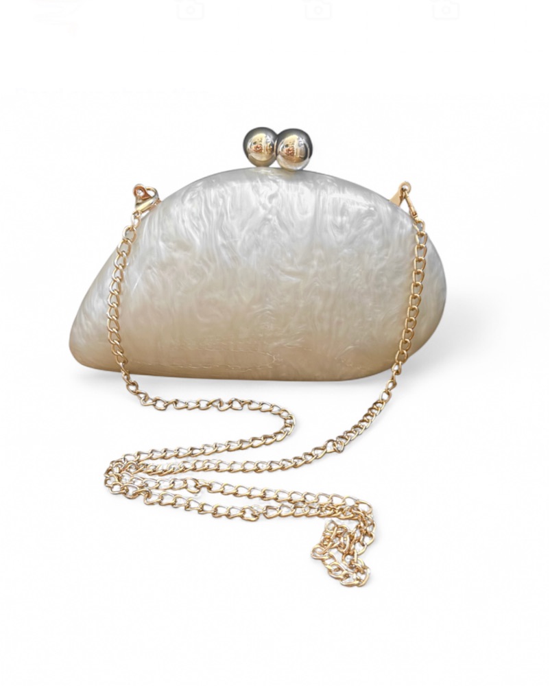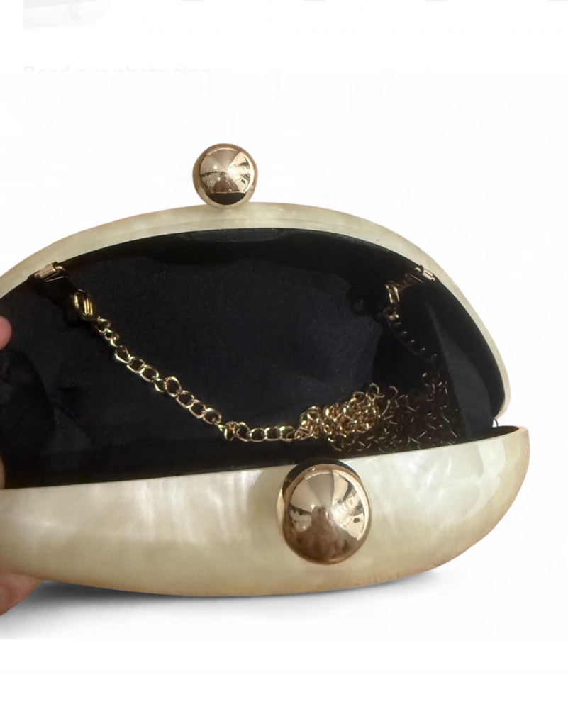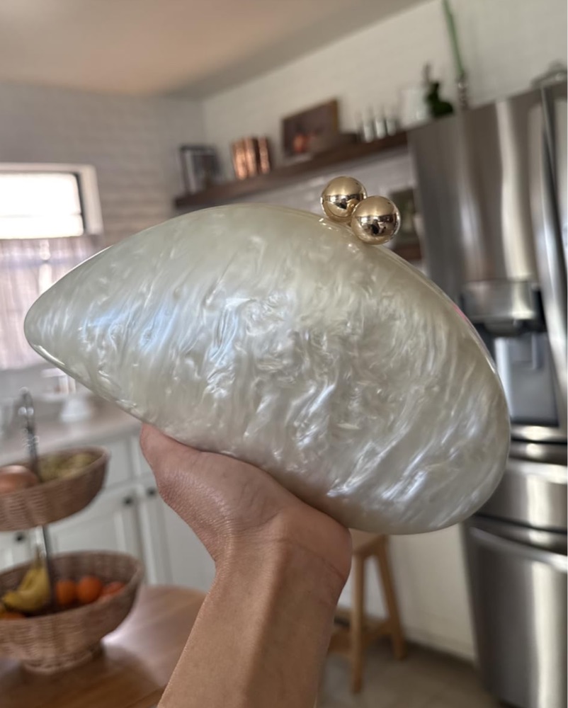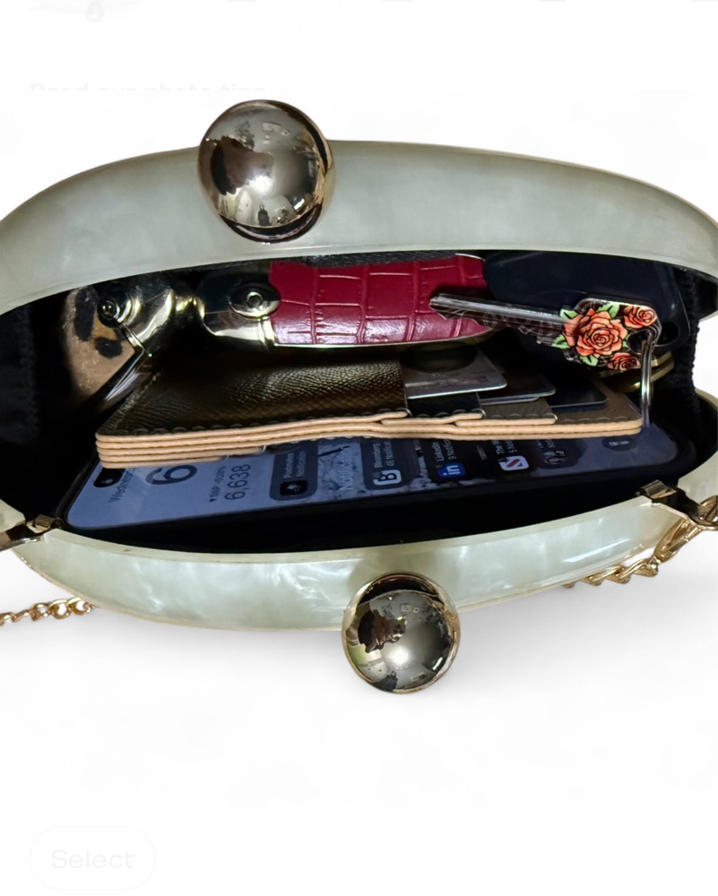 Comes with chain that tucks inside the clutch! Dupe — perfect for weddings and vacations :) Fits an iPhone, keys & cardholder but not an iPhone Max!