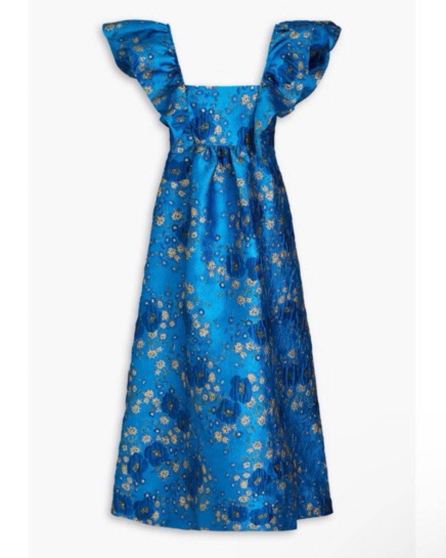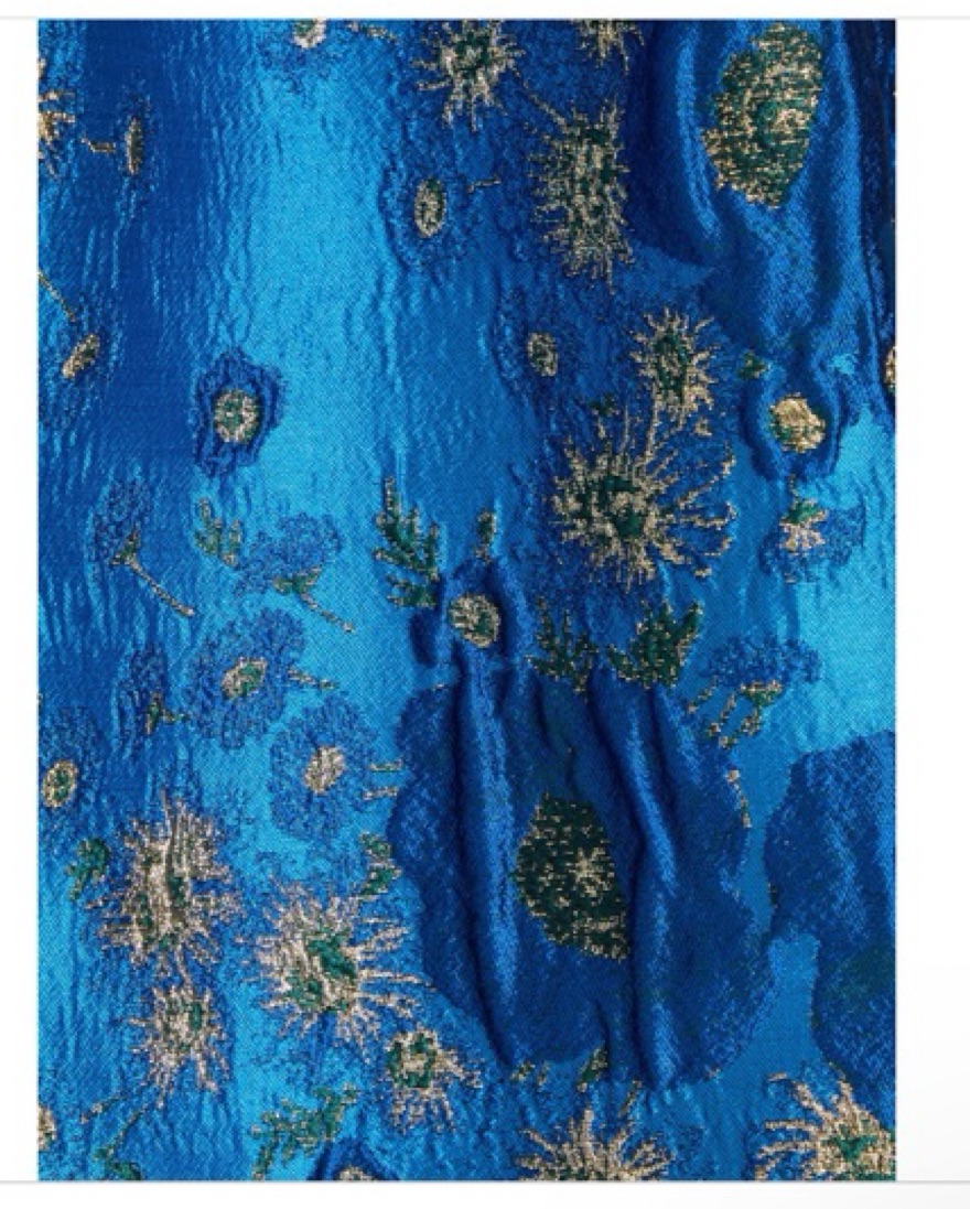 Gorgeous textured blue and gold GANNI evening dress, the perfect wedding guest outfit. Inspired by Van Gogh’s starry night 🌟