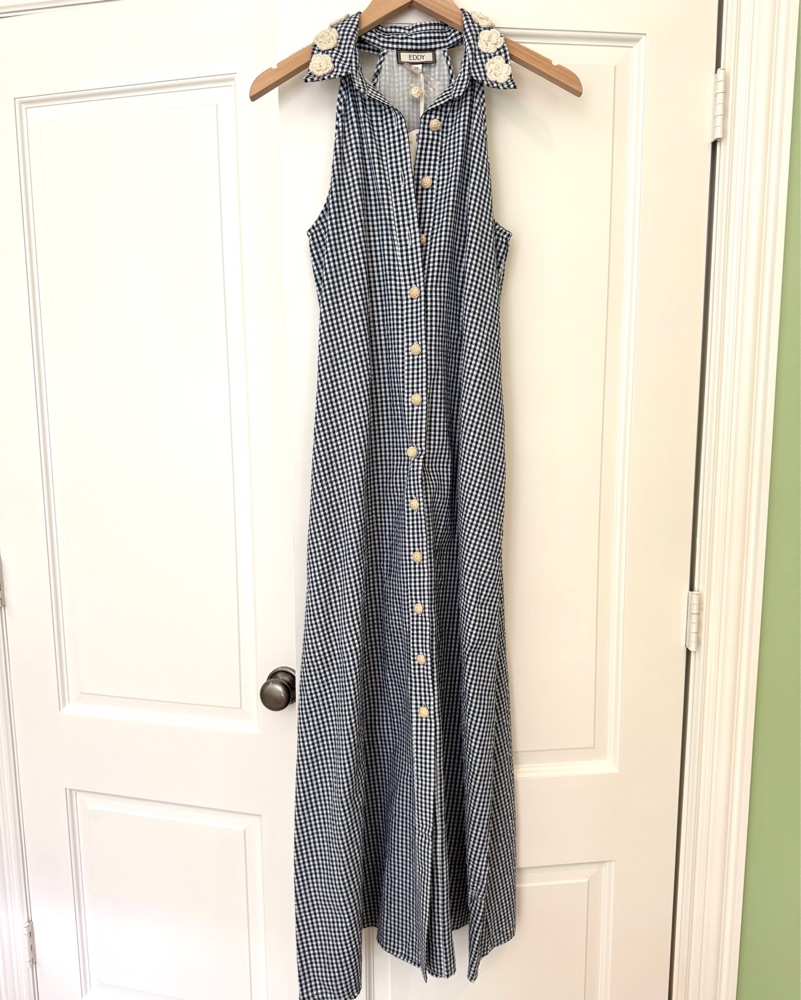 Beautiful black gingham sleeveless maxi dress. Crocheted flower details on the collar and buttons.
