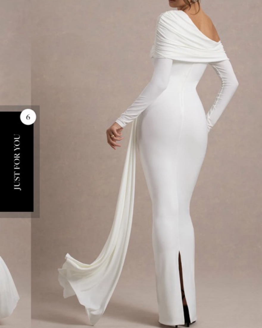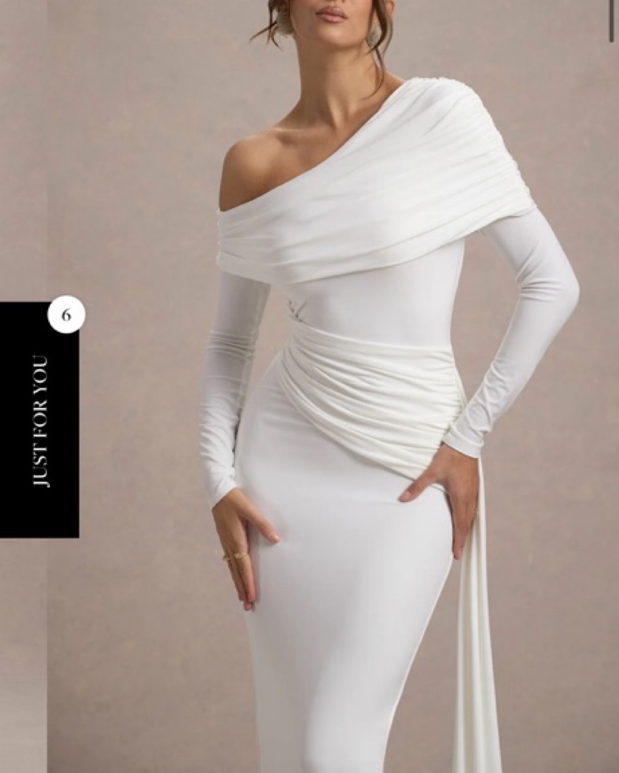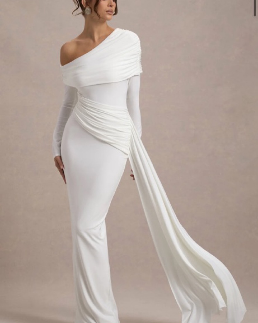 VALINA. WHITE RUCHED ASYMMETRIC MAXI DRESS WITH DRAP. Worn once for rehearsal dinner. Dry cleaned.