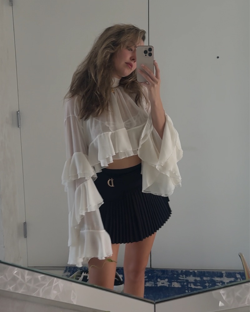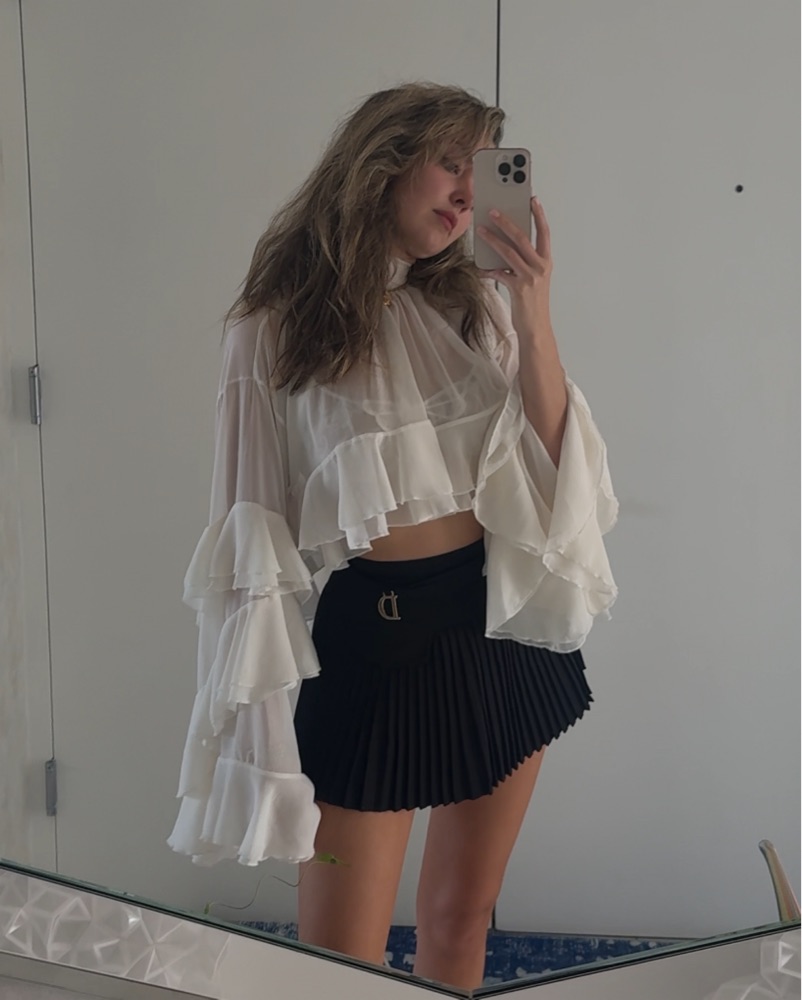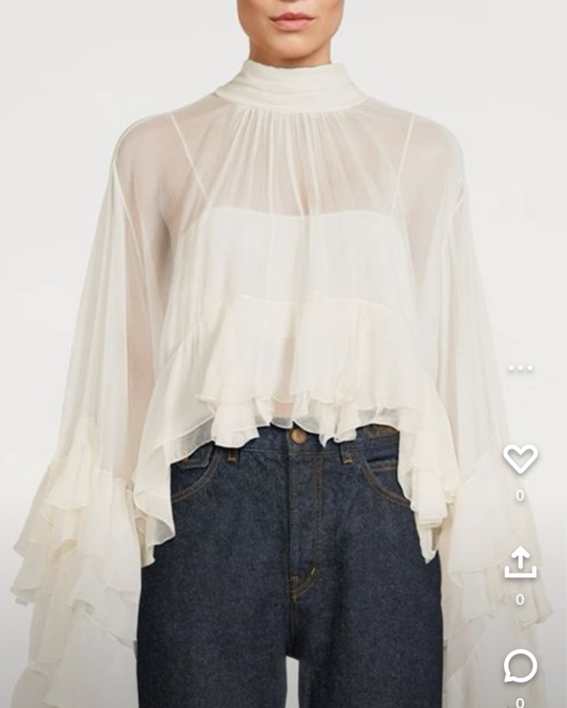 This delicate, flowing chiffon blouse with its dramatic ruffled sleeves exudes an ethereal, romantic style. Pair it with high-waisted bottoms for a chic, modern look.