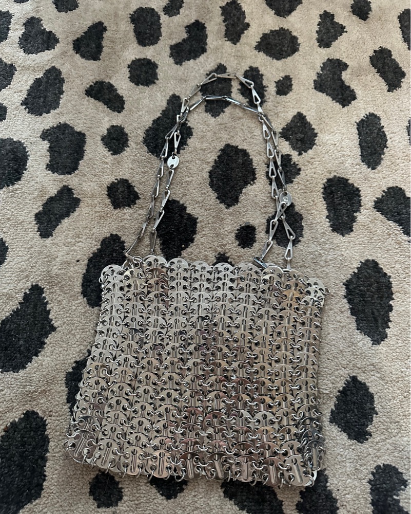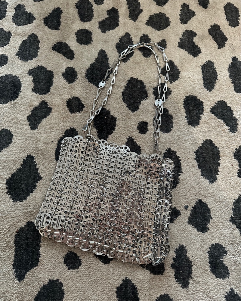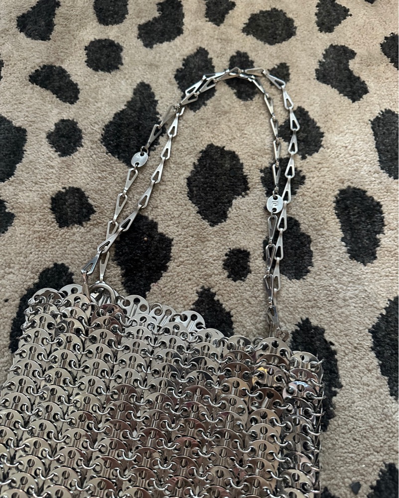 This exquisite silver chainmail purse is a statement piece that can elevate any outfit. Wear it to a chic cocktail party or a glamorous night out. Paco Rabanne look a like