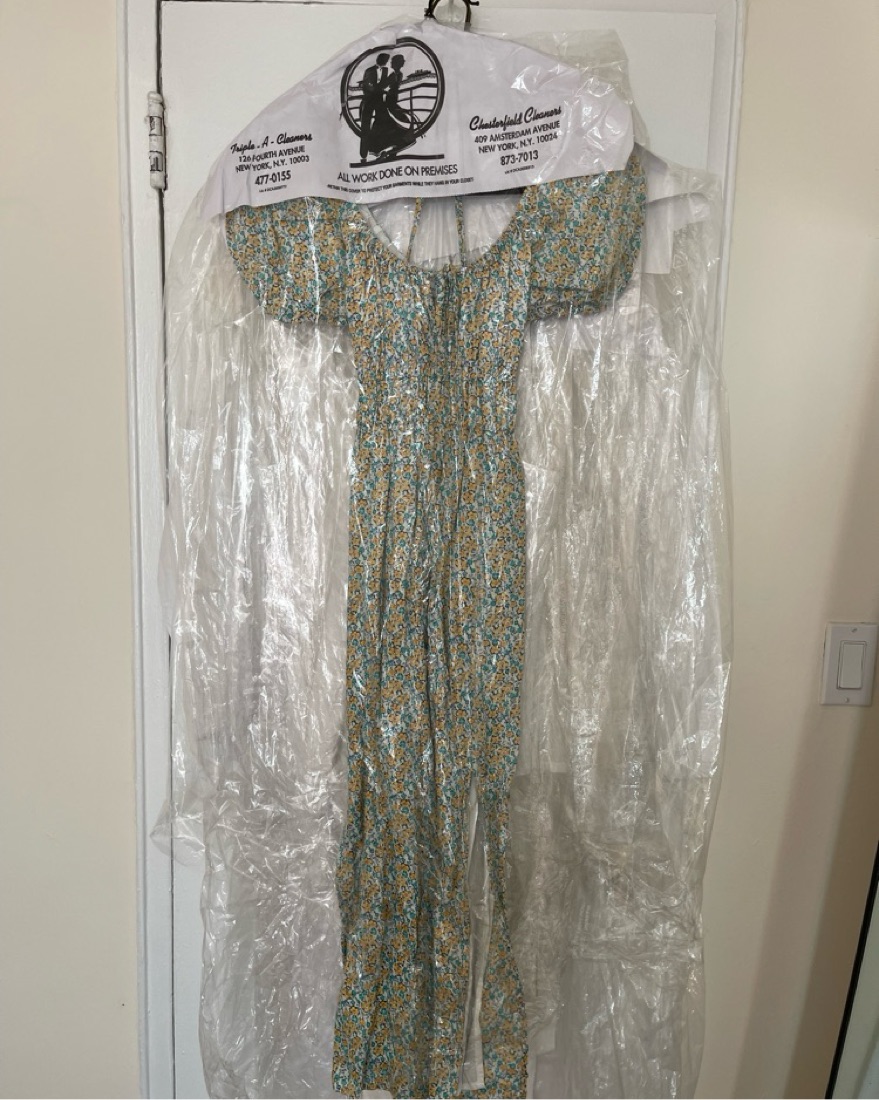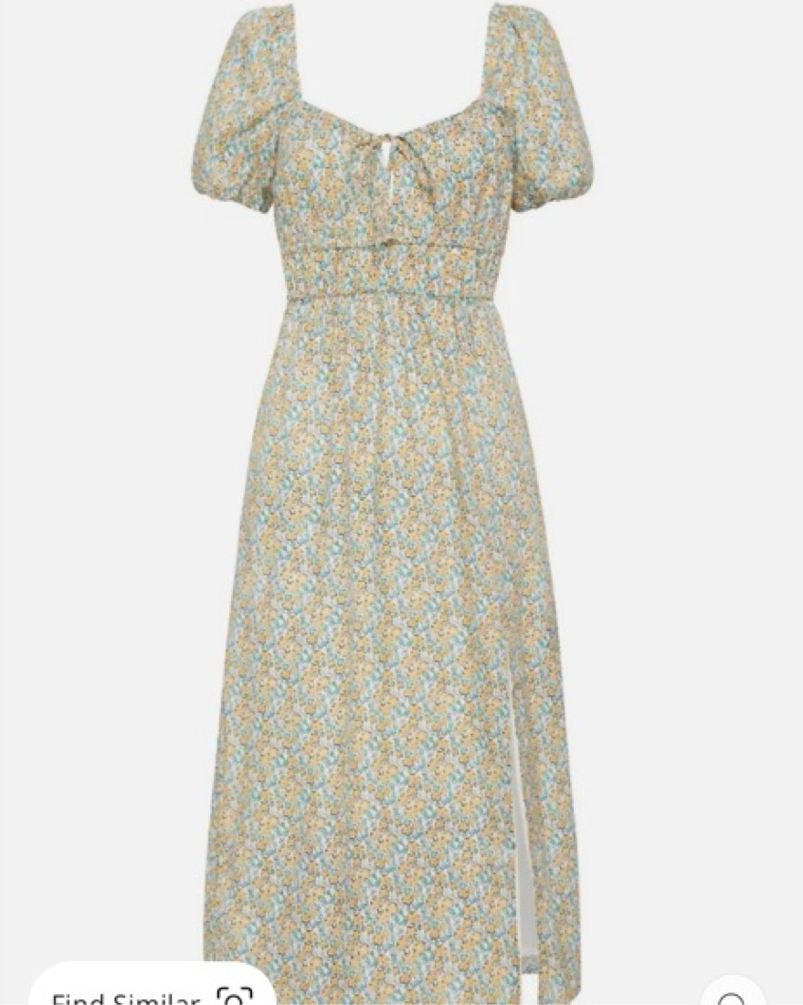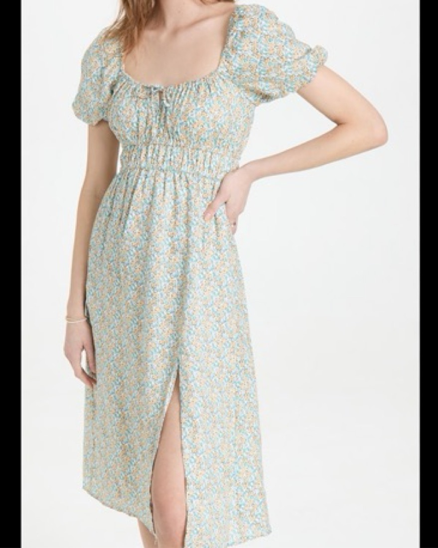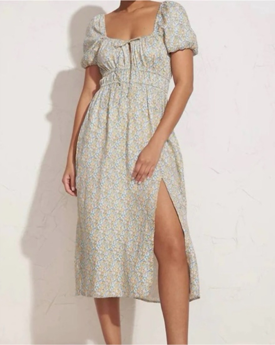 *sold out* faithfull the brand terina midi dress in blue/yellow/white floral multicolor. Size small/US 4/AU 8. Lined linen with front leg slit, elasticized waist, sleeves, and bust creates flattering, comfortable silhouette