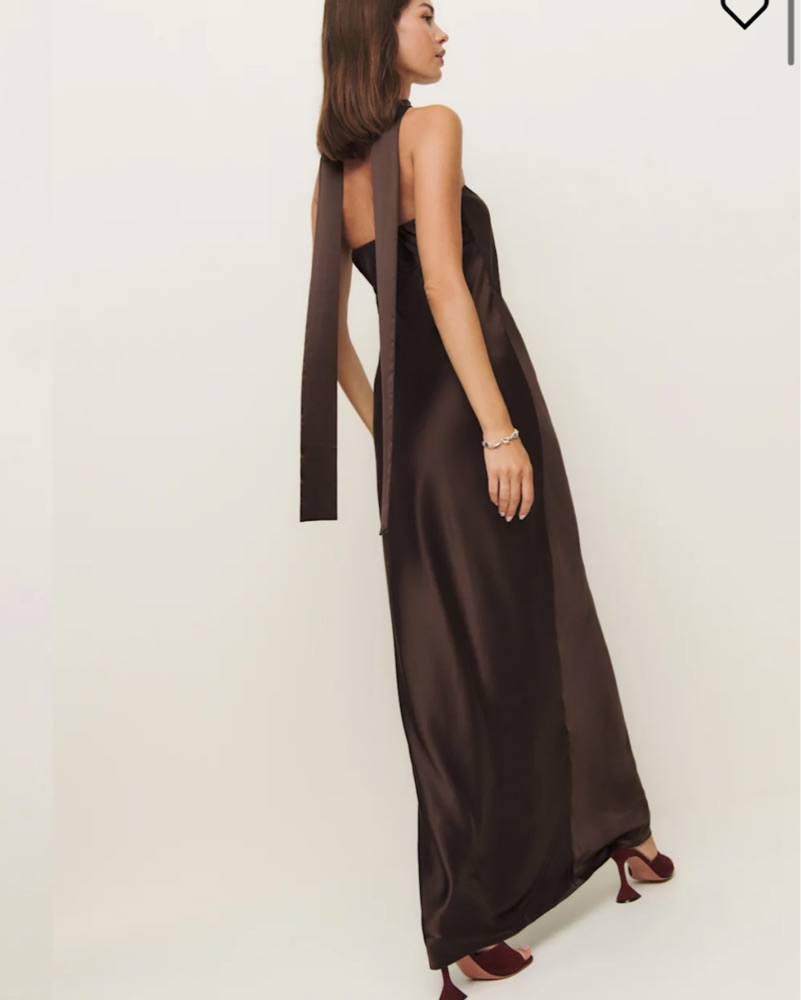 Size xs, worn once, brown strapless maxi silk dress with neck scarf