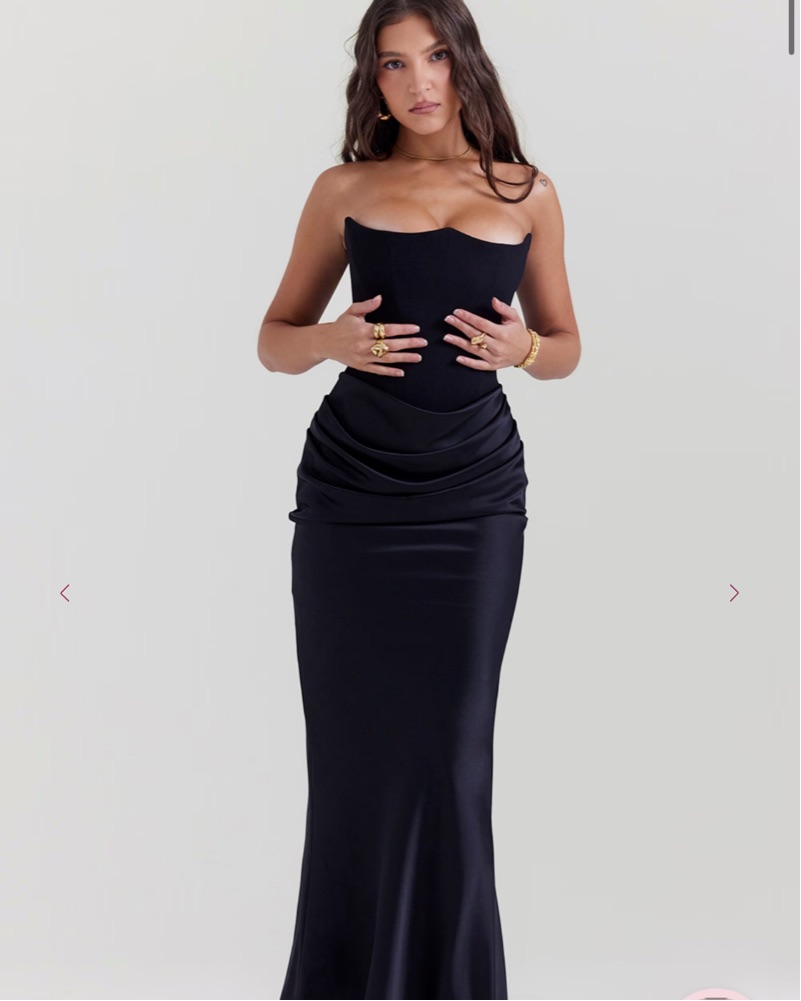 XS, hits ground with 2.5 in heels on a 5’3 person, A-C cup size, please do not bend corset, no alterations