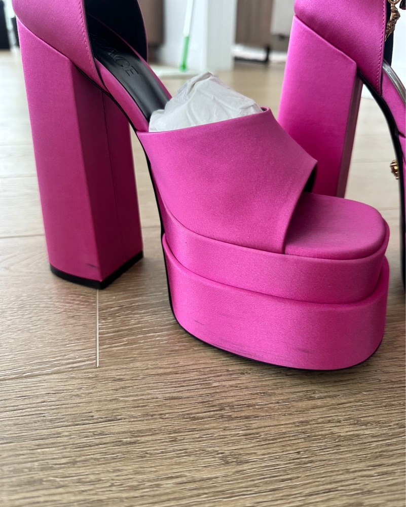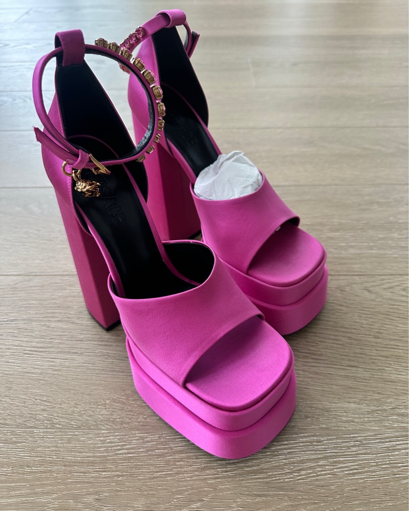 The Medusa Aevitas pumps from Versace are a lesson in statement glamour. They're made from lustrous fuchsia-pink satin with bold, towering double platforms. And it doesn't stop there – the ankle straps are embellished with crystals and Medusa charms.