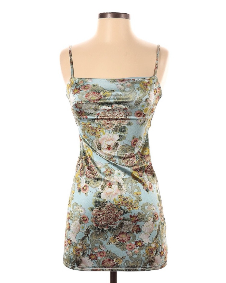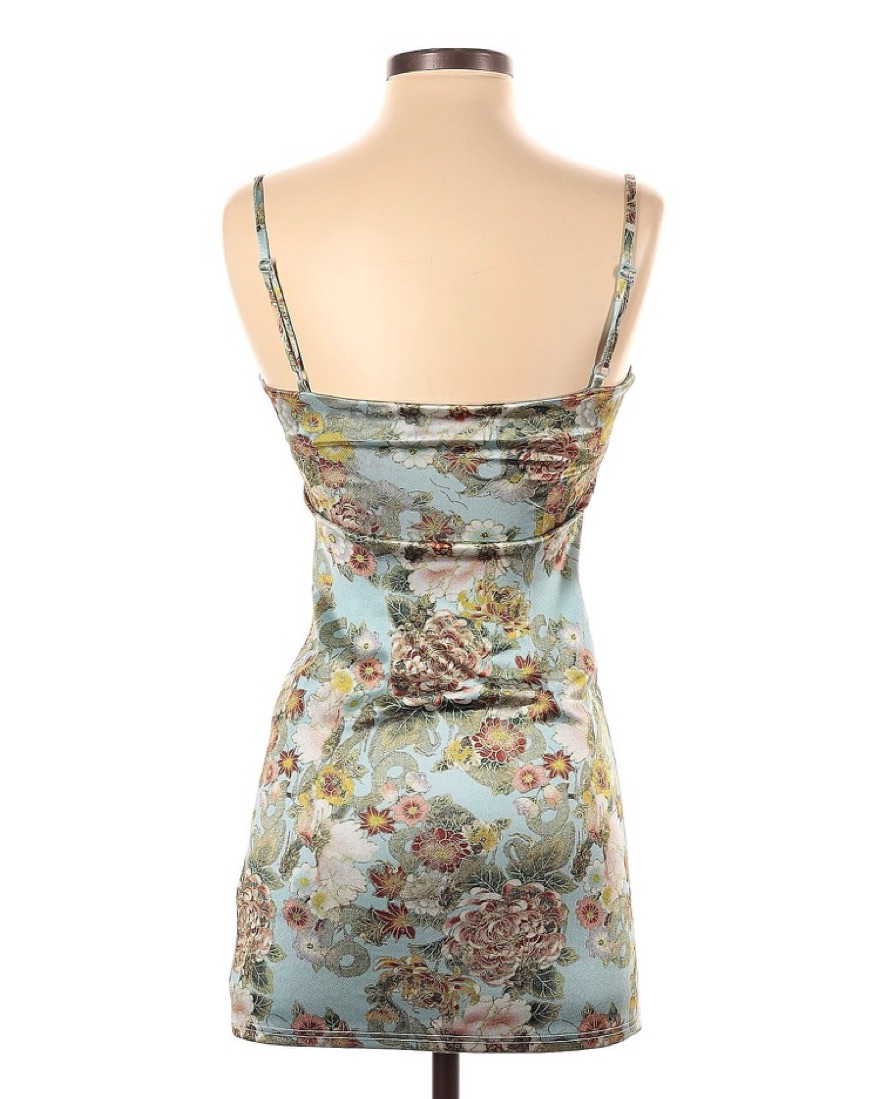 Adorable oriental metallic satin/silky light teal blue bodycon dress from Urban Outfitters. LIKE NWOT - new without tags (only worn/used twice!) Thin adjustable bra-like spaghetti straps to tighten. Sexy summer, spring, vacation, date / casual / semi-formal party. SIZE S. 91% polyester, 9% spandex.