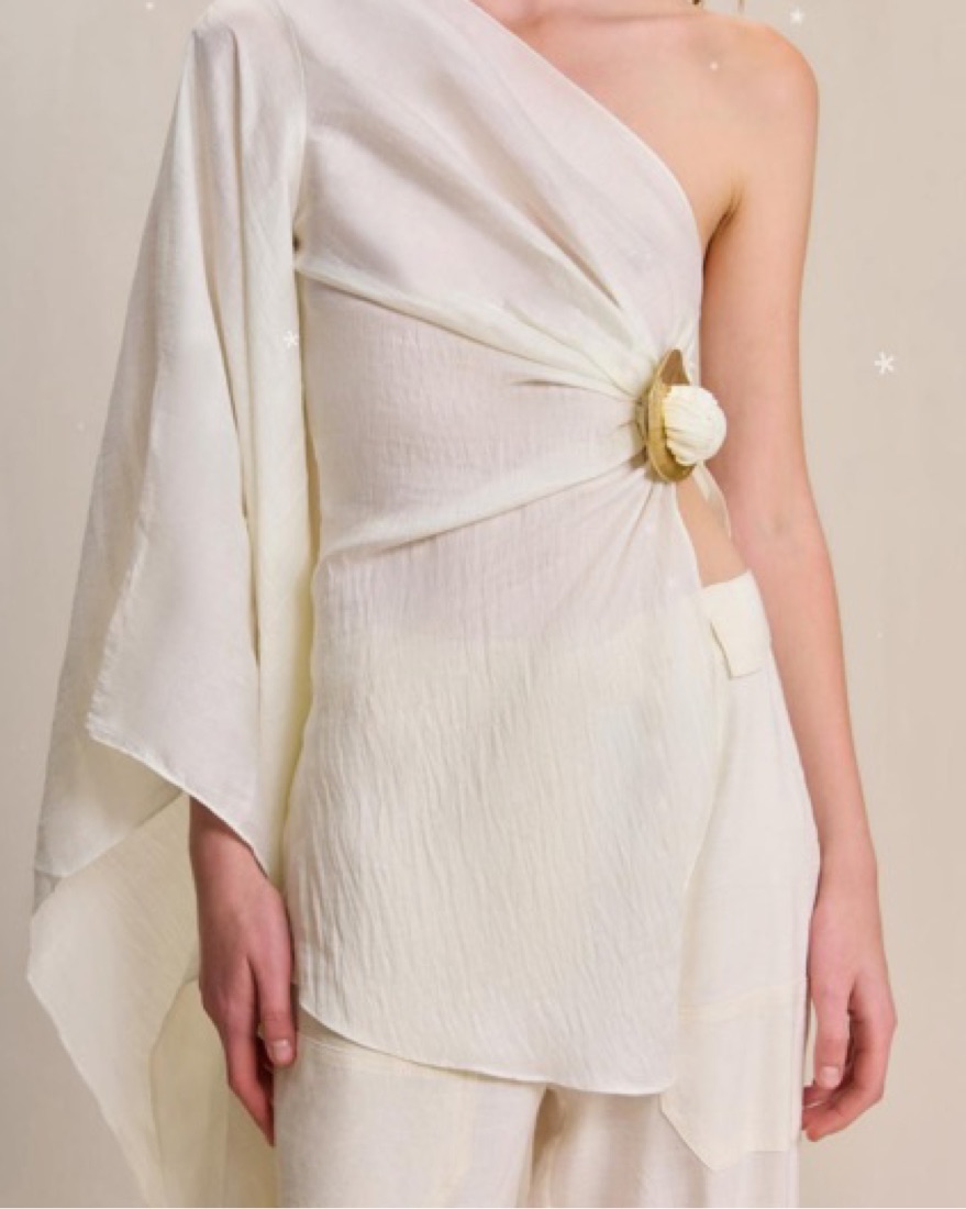 Stunning cream-white Cult Gaia one shoulder flowy-sleeved top. Has beautiful linen fabric and gold detailing on the side. SIZE: Xs, CONDITION: Excellent