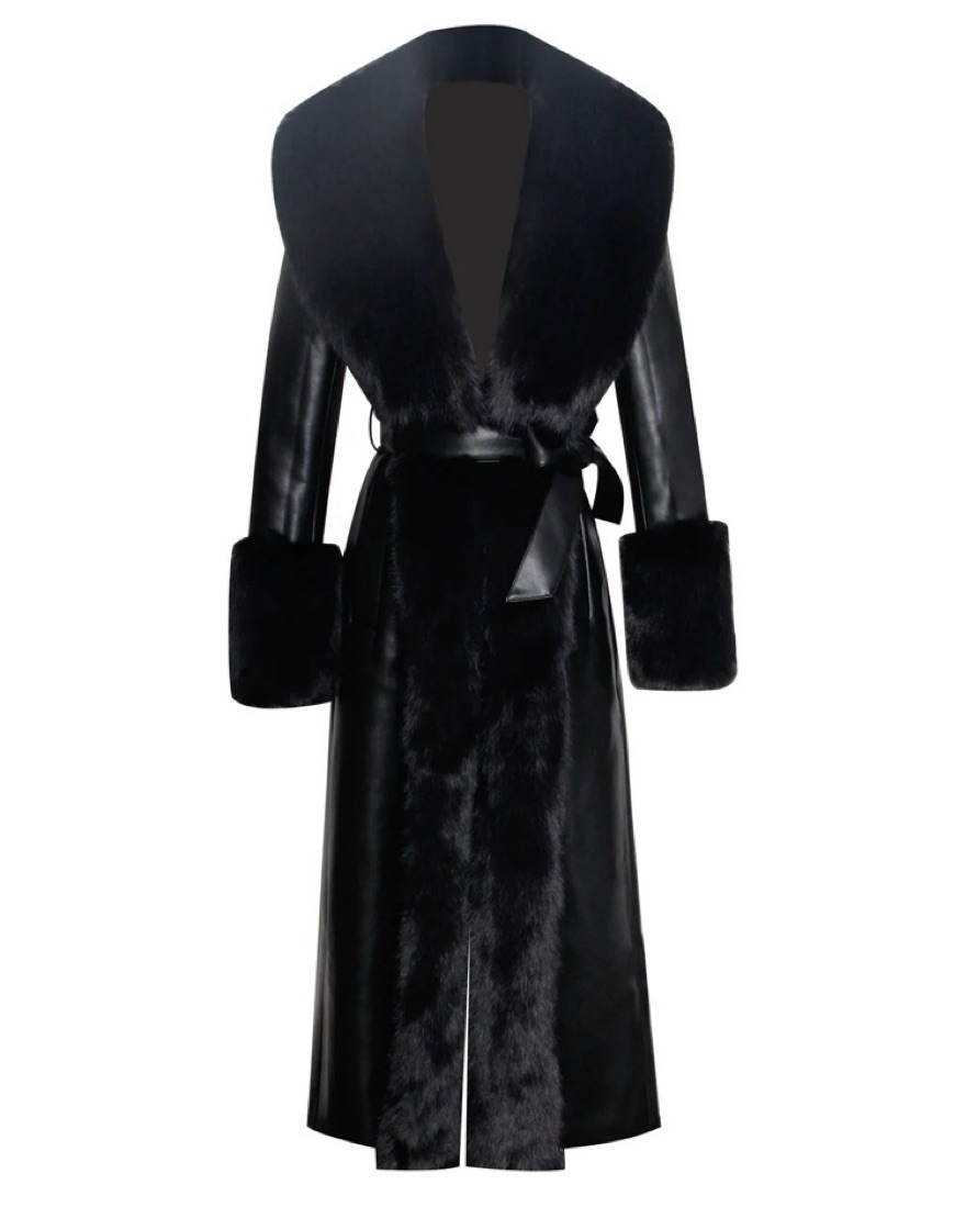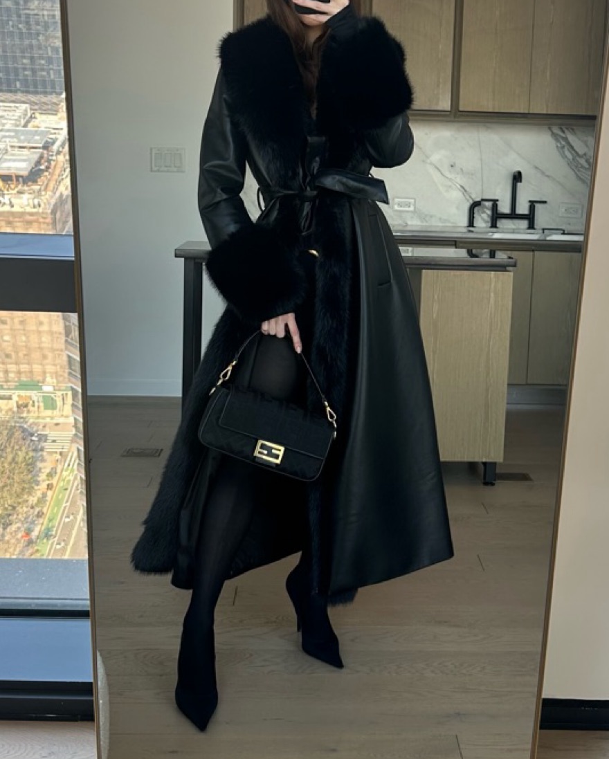 Sold out! So chic. Size Small. Party, event, ski trip, winter coat, faux fur, mob wife, vegan leather, aprés ski, fashion week, NYFW, birthday, wedding. Also renting the Fendi bag seen in photo. Great for winter vacation. Easy to dress up or down.
