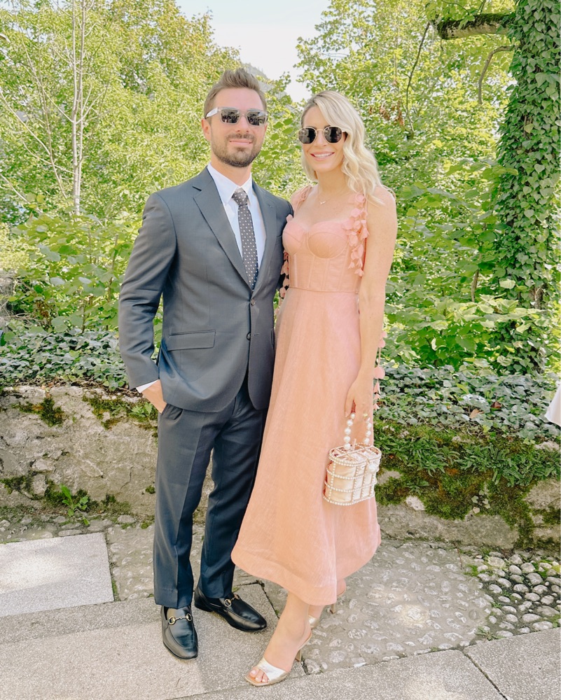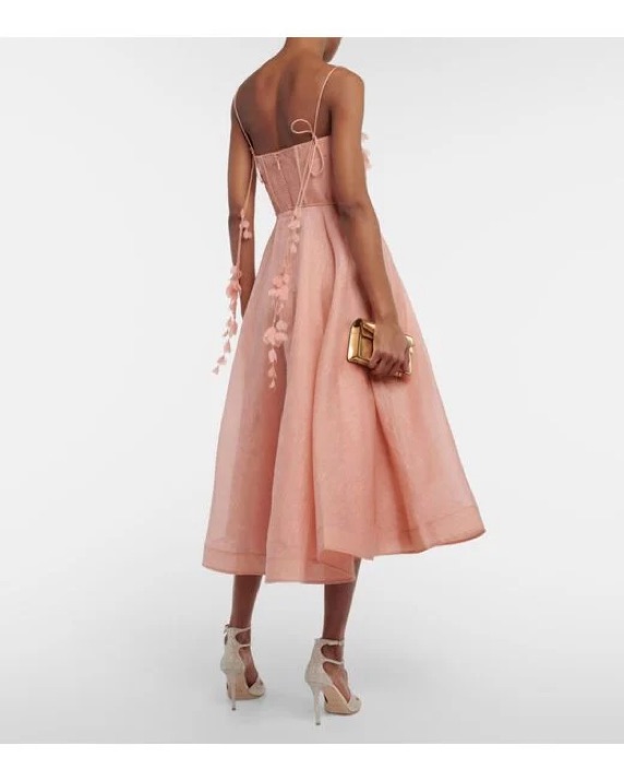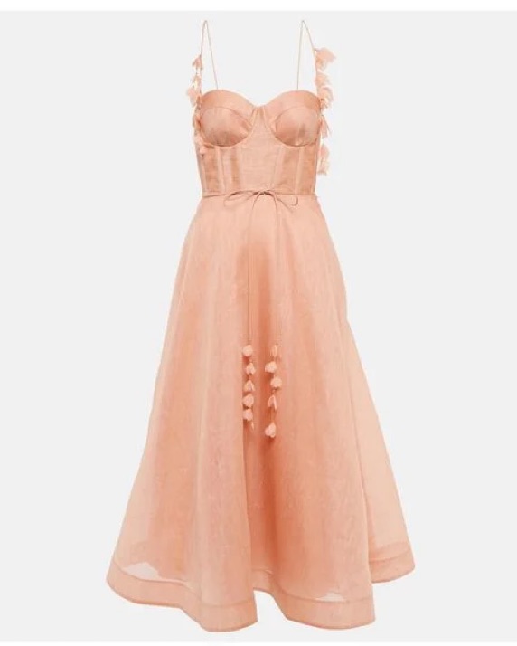 blush pink linen-silk blend corset style spaghetti straps flower appliqués tied waist two side slit pockets shirred panel rear zip fastening full skirt mid-length. Zimmermann Size 1. Paid $1600