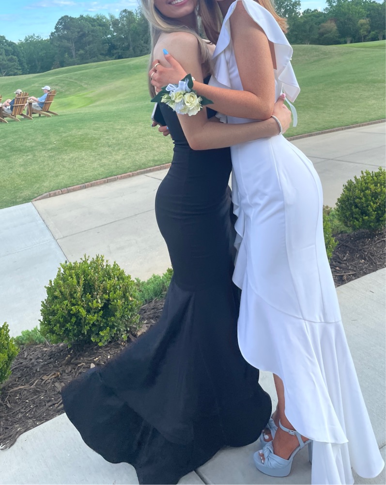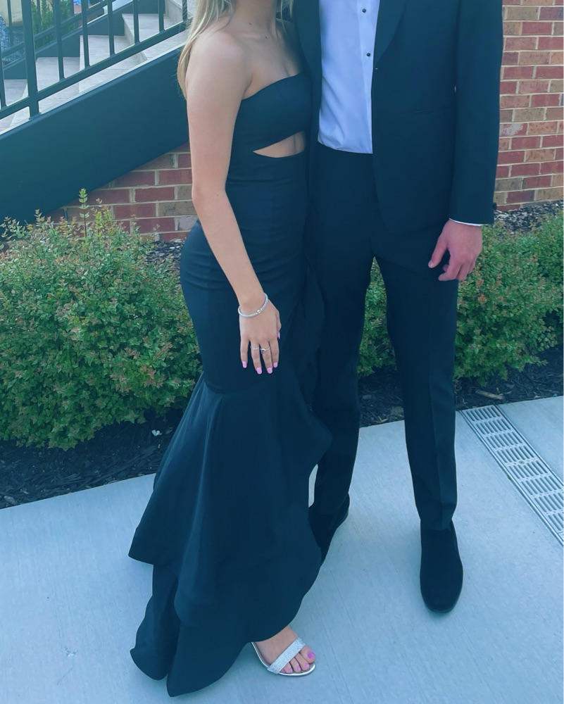 This sleek and classy mermaid gown is PERF for formal occasions!! The black is striking and the cutout creates a unique & stunning look.