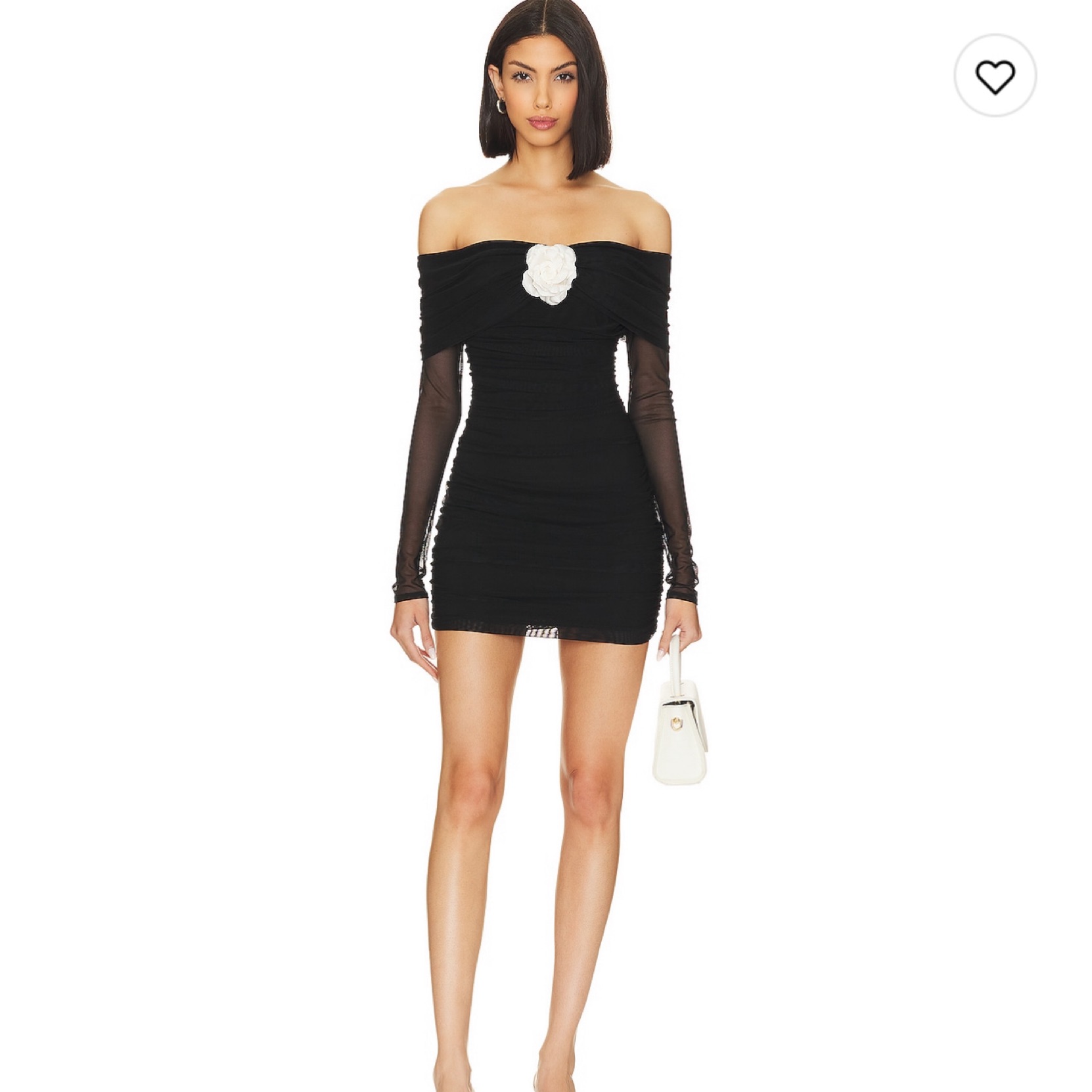Black off the shoulder mini dress with white rose.