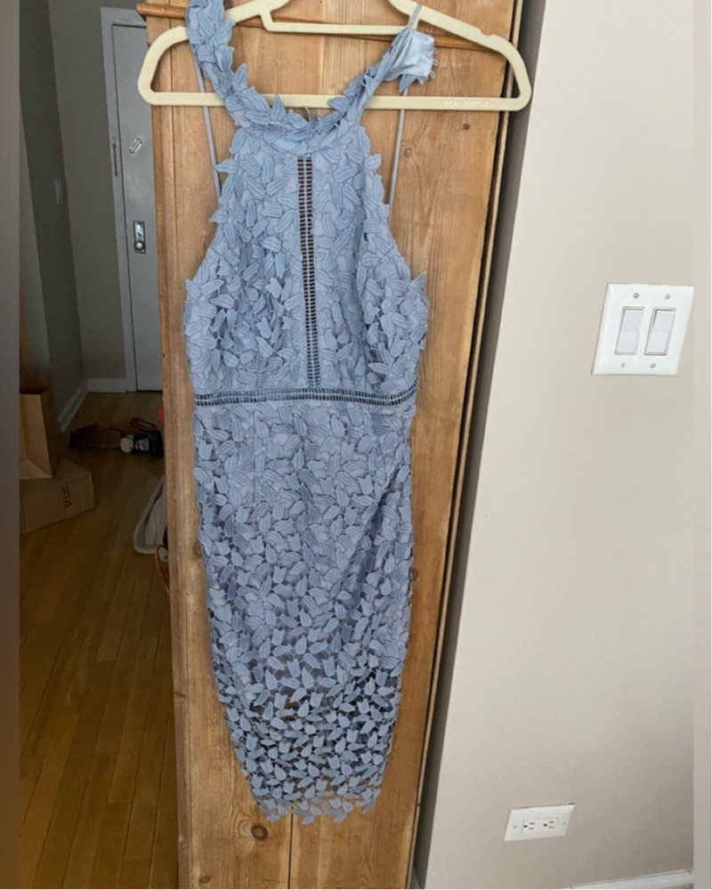 This delicate lace midi dress is perfect for a special occasion. The fluttering ruffles and intricate lace detailing create a whimsical, feminine look.