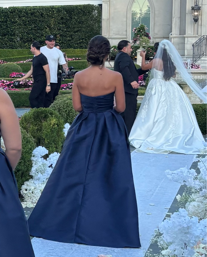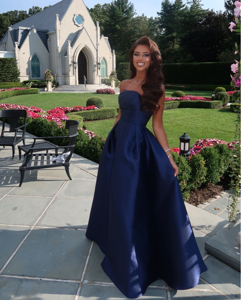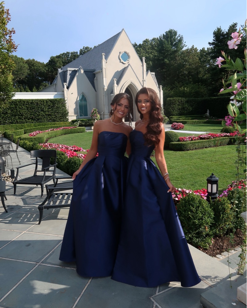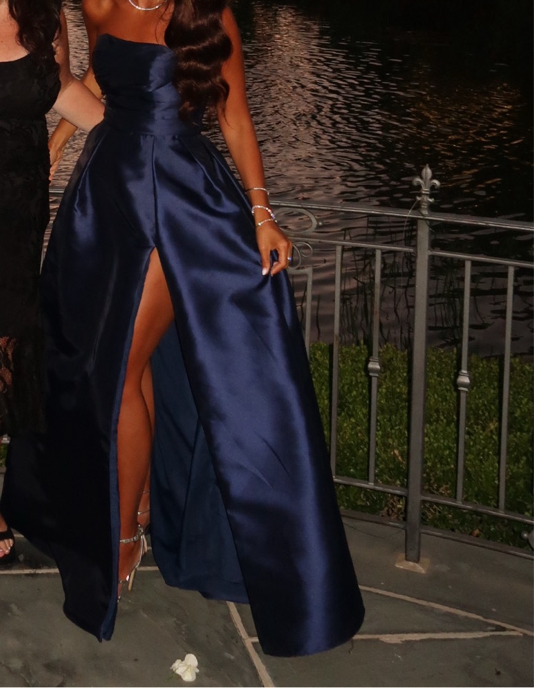 Strapless and has a slit. The strapless neckline and full skirt create a glamorous, princess-like silhouette. I have 2 ( size 2) dresses if needed for a bridal party.