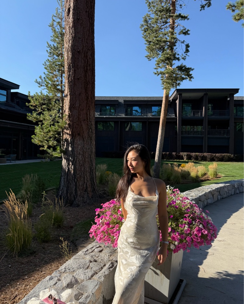 This stunning white lace gown is perfect for a formal occasion. The fitted silhouette and intricate lace details create a beautiful and sophisticated look.