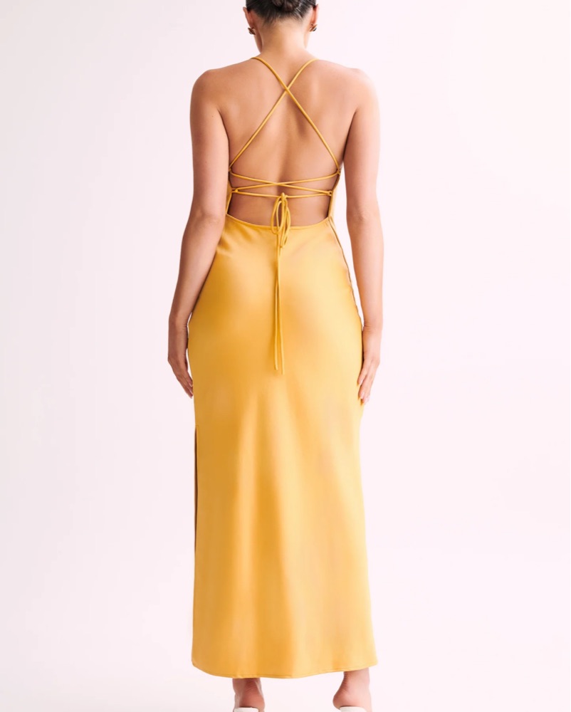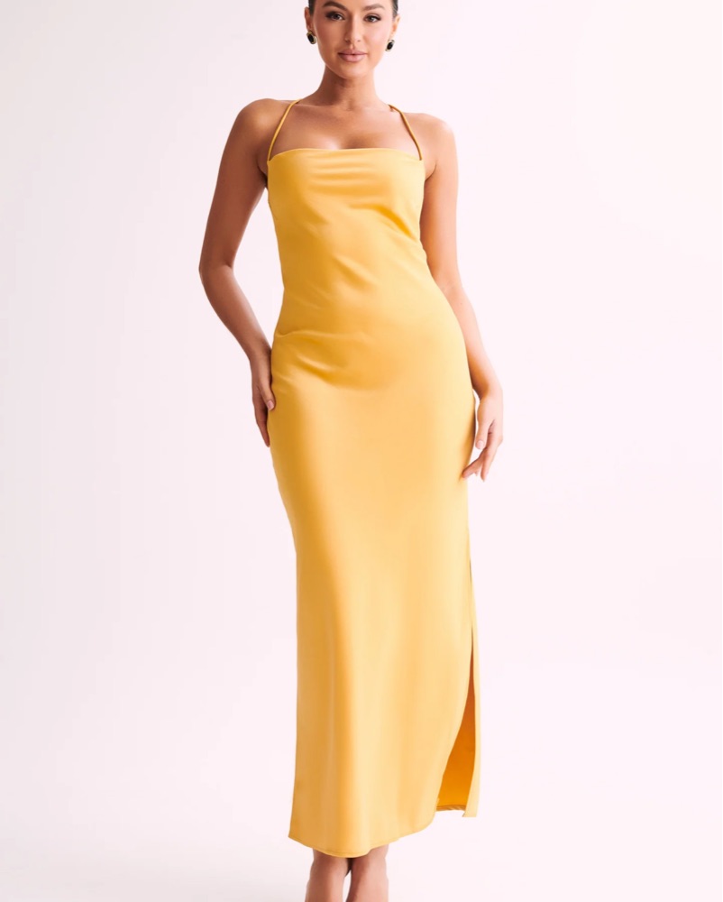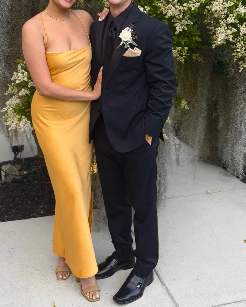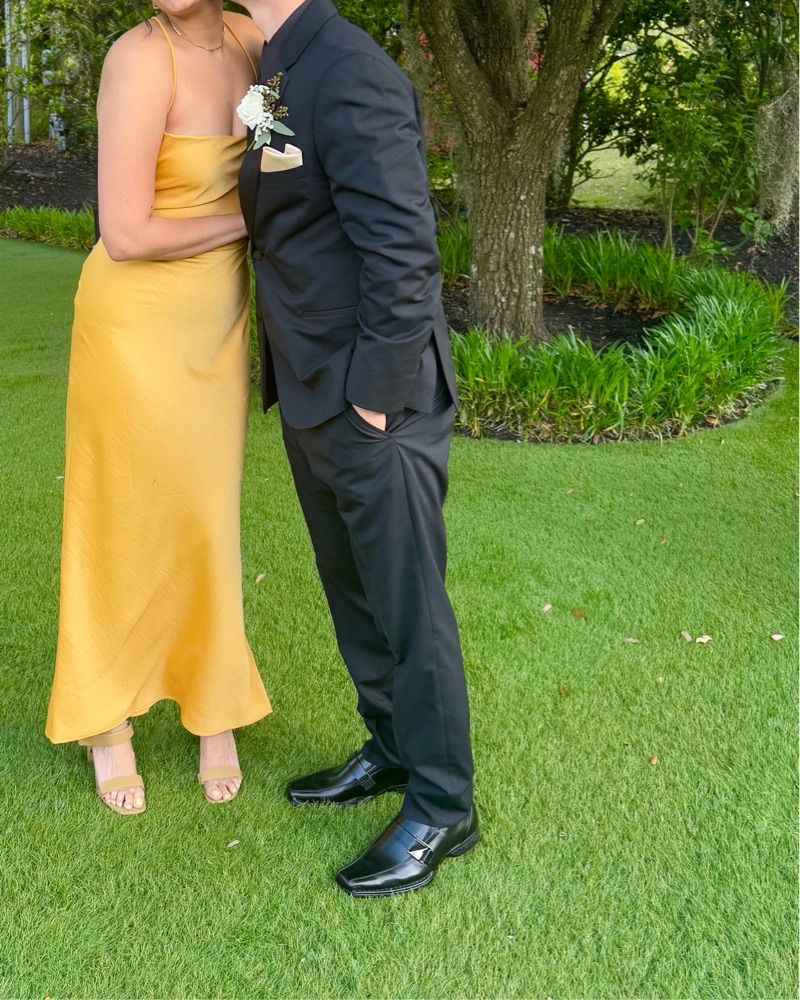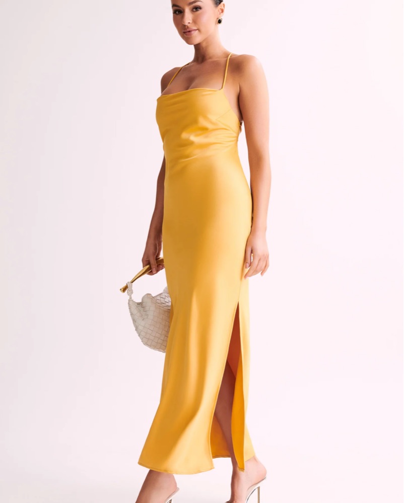 I got SO many compliments on this dress! It’s a yellow/gold color. I’m 5’6” and the dress falls at the perfect height to still wear heels. Perfect for a spring or summer wedding!