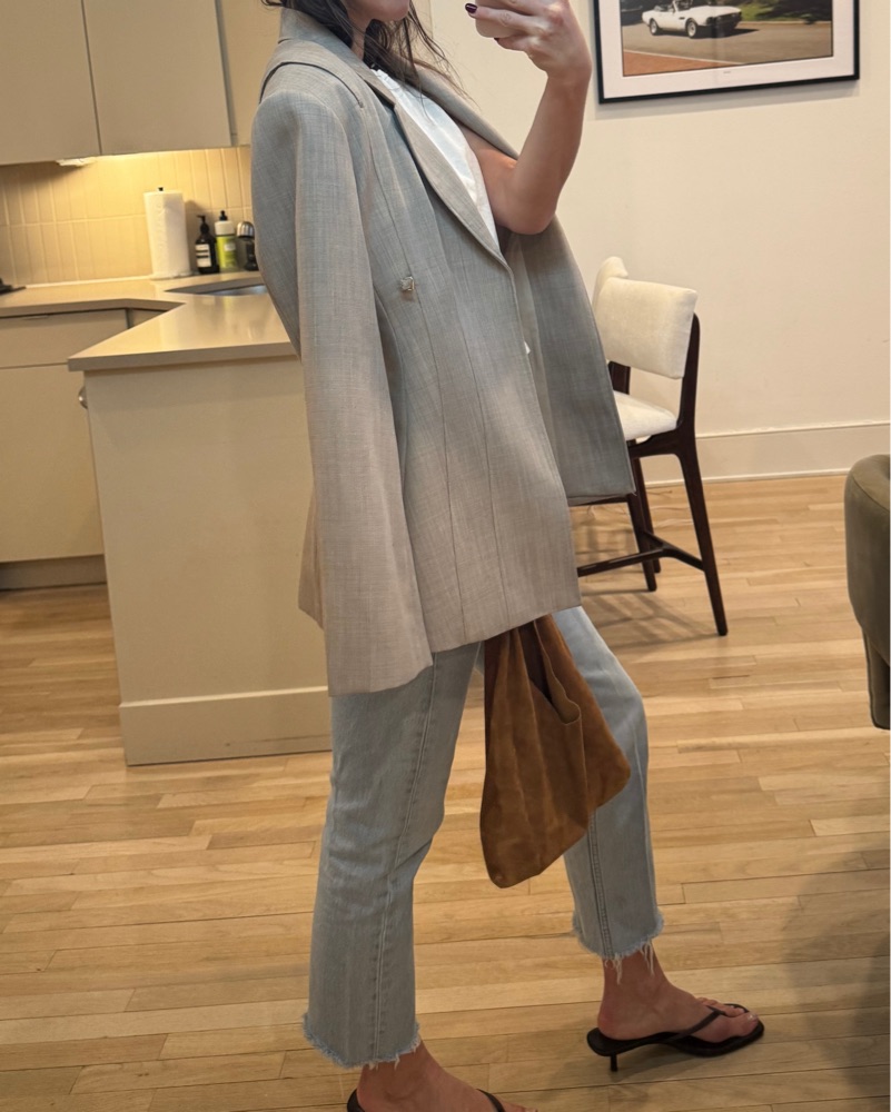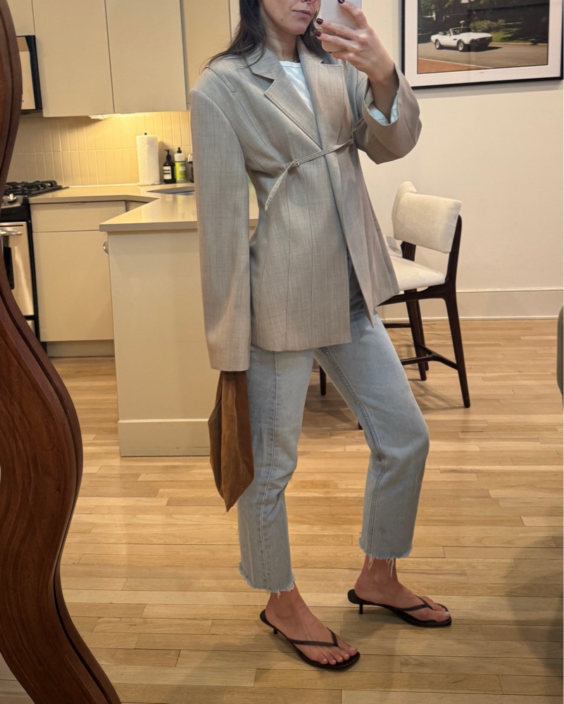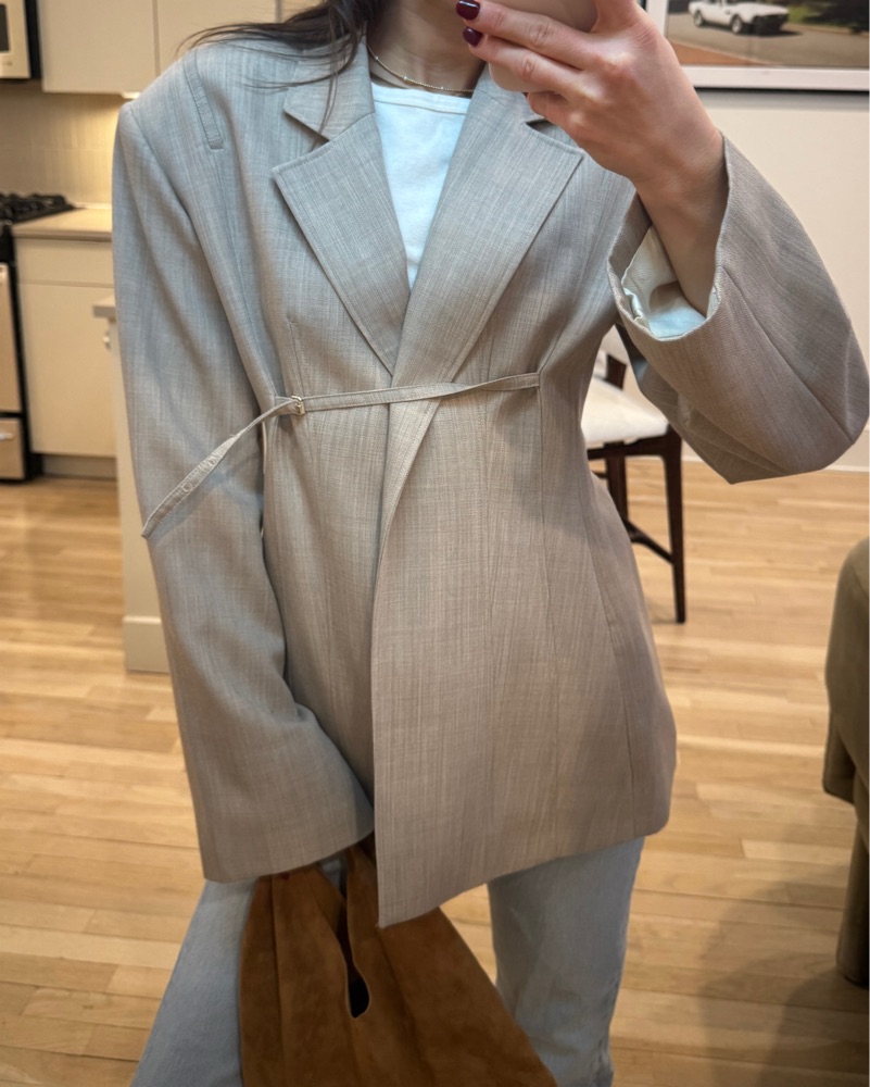 Oversized, structured blazer with optional chest strap to be worn 2 ways. Dry cleaning after use required. French Size 40 = US size 6/8. I typically wear a 0-2.