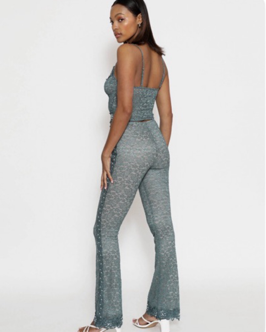 Brand new. Wore for my bday! Size XS in too and bottom. Gorg dark teal lace set with lining and pearl and sequin embellishments.