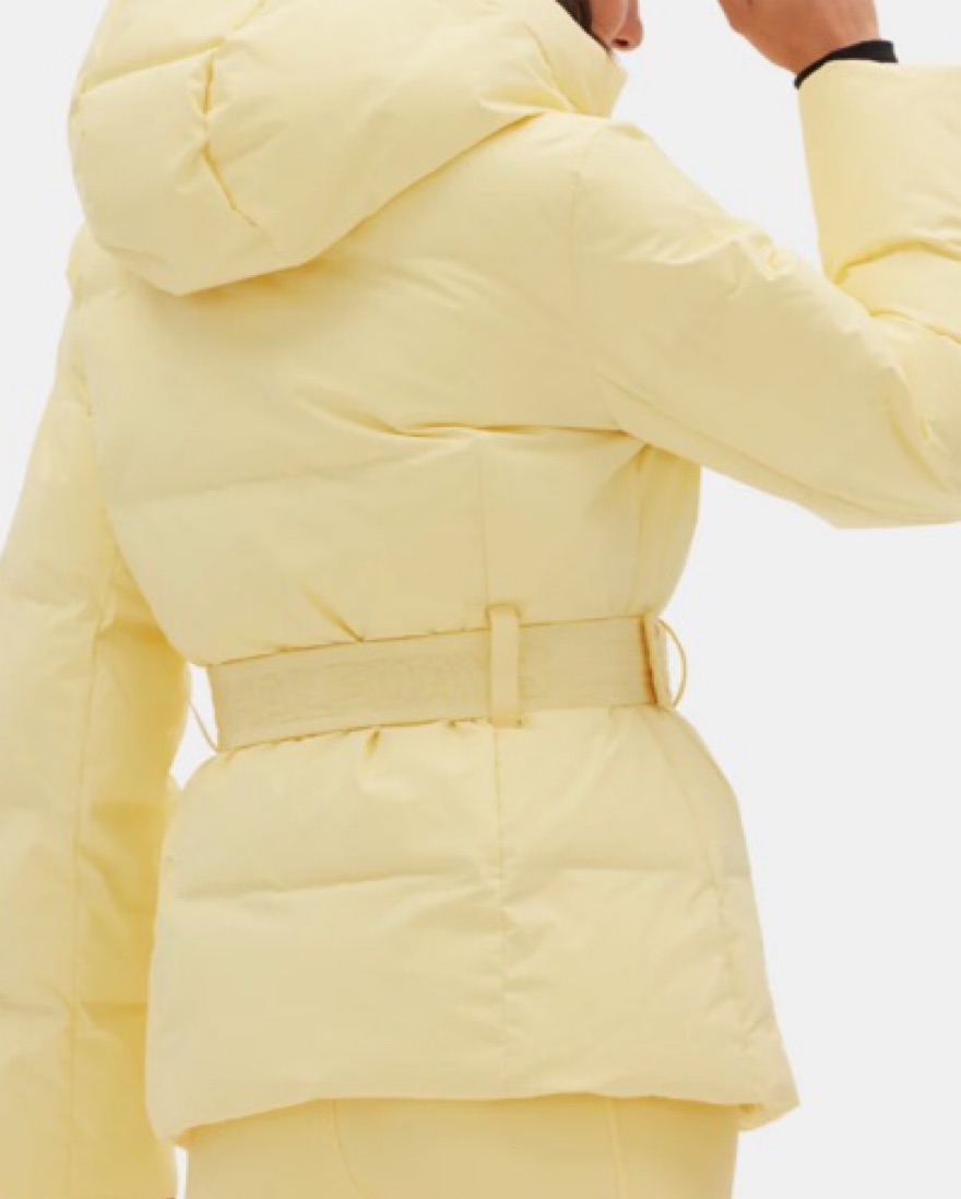 This bright and cheerful puffer jacket is perfect for keeping warm while looking stylish. The belted silhouette flatters the figure and the oversized hood provides extra coverage.