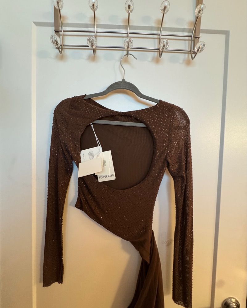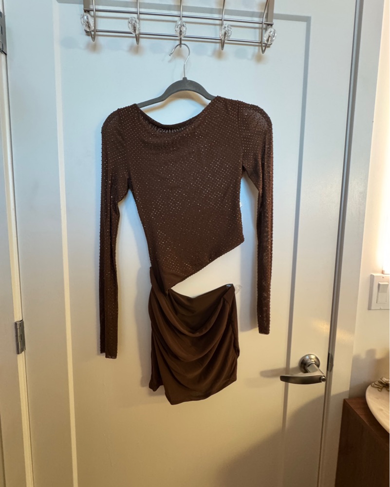 This stunning brown sequin mini dress is perfect for a night out or special event. The long sleeves and fitted silhouette create a flattering, elegant look.