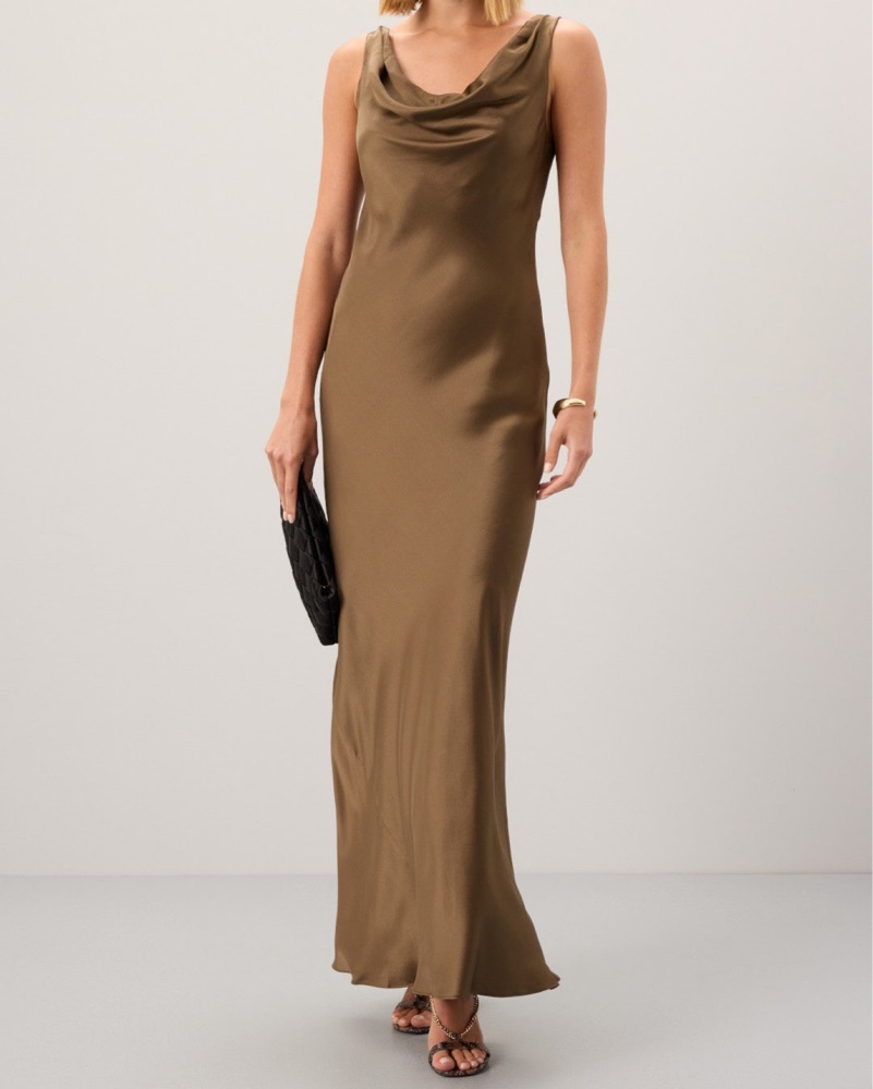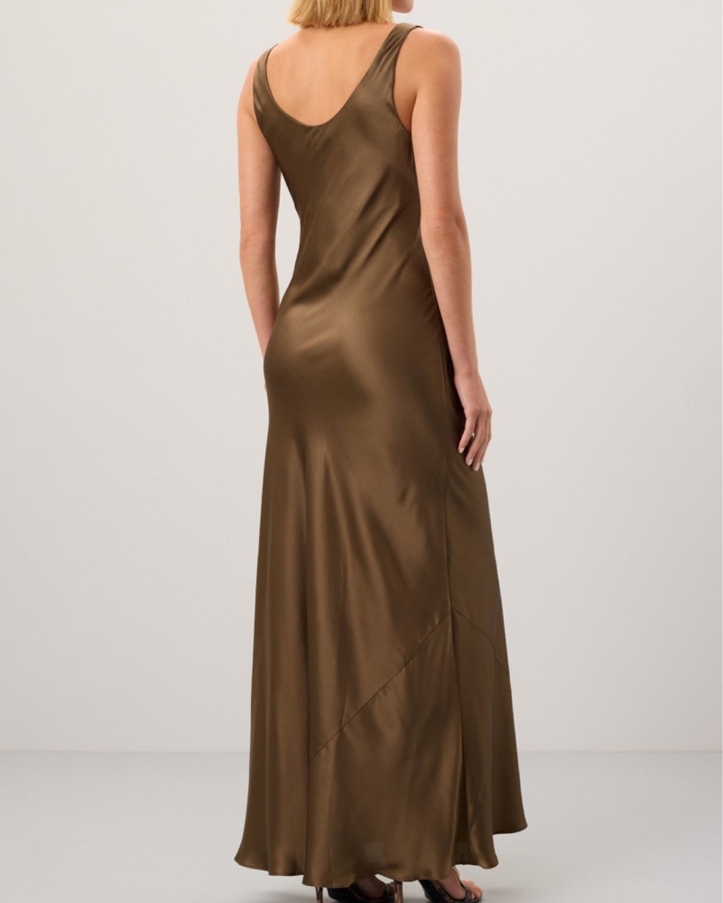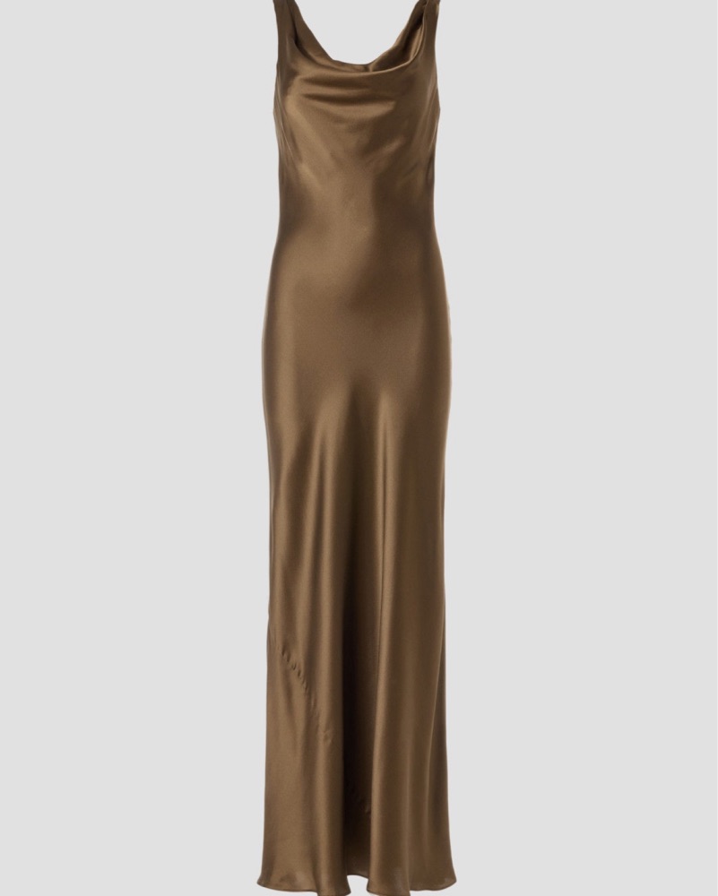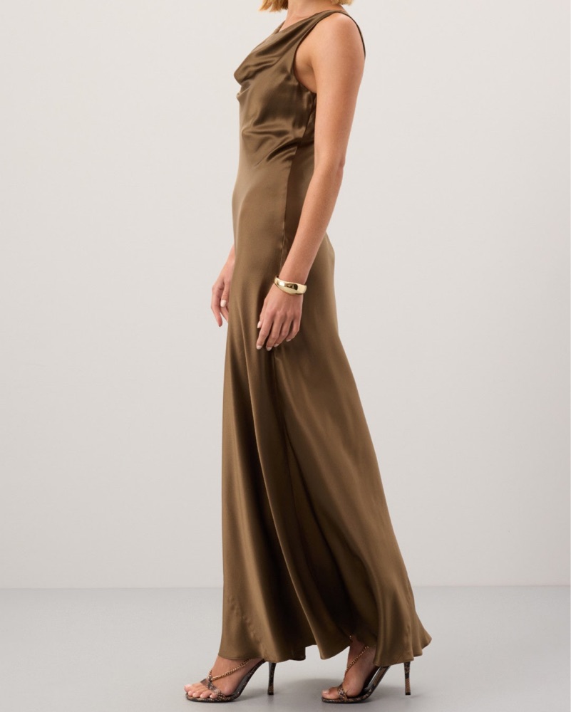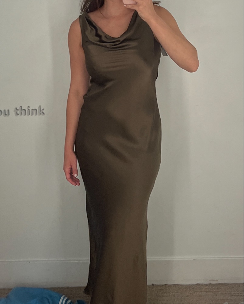 Size 0 but fits up to size 4, Second photo shows dress on size 4, - 100% silk. Brown color with olive green undertone, Shoulder to Hemline 58". Wedding guest dress, formal dress, winter