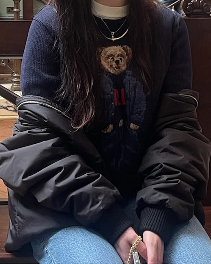 This cozy polo-style sweater with a playful teddy bear graphic is perfect for a casual day out or a weekend brunch. Men’s S for an oversized fit, first pic is the actual design