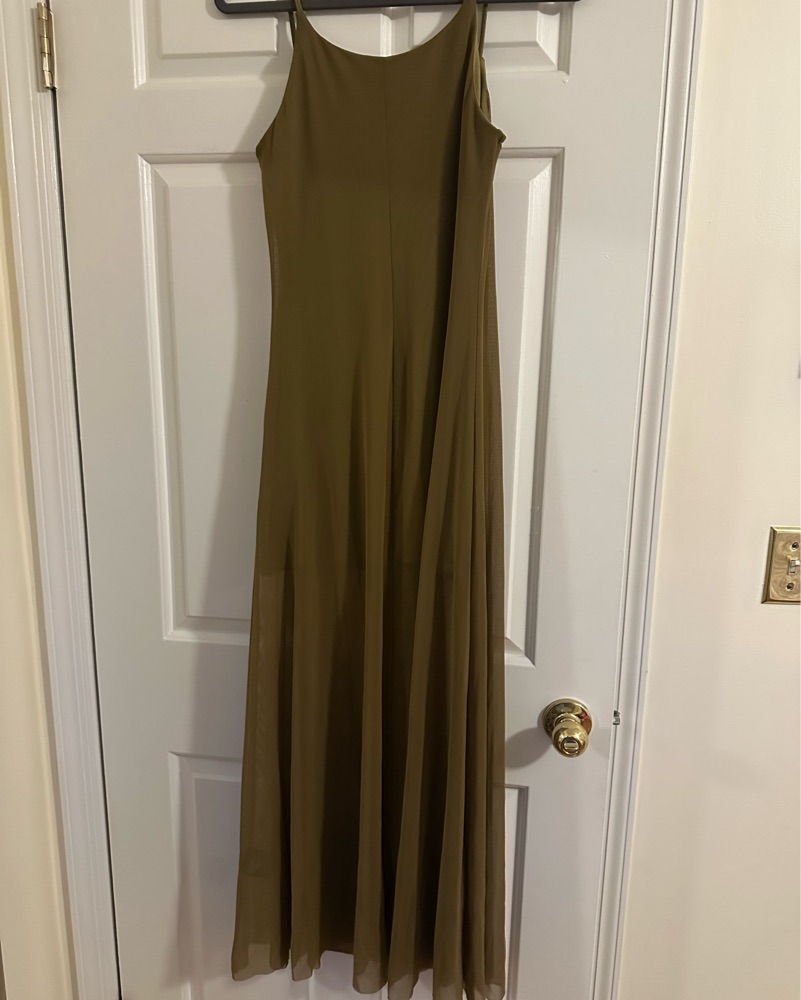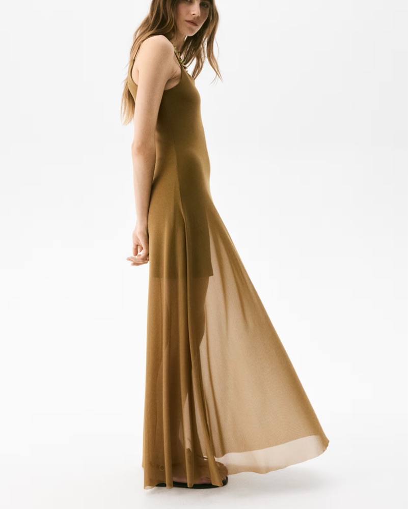 Fitted, ankle-length dress in sheer mesh. Extra-narrow shoulder straps, a scoop neck, and flared skirt with a raw-edge hem. Short liner dress in jersey.