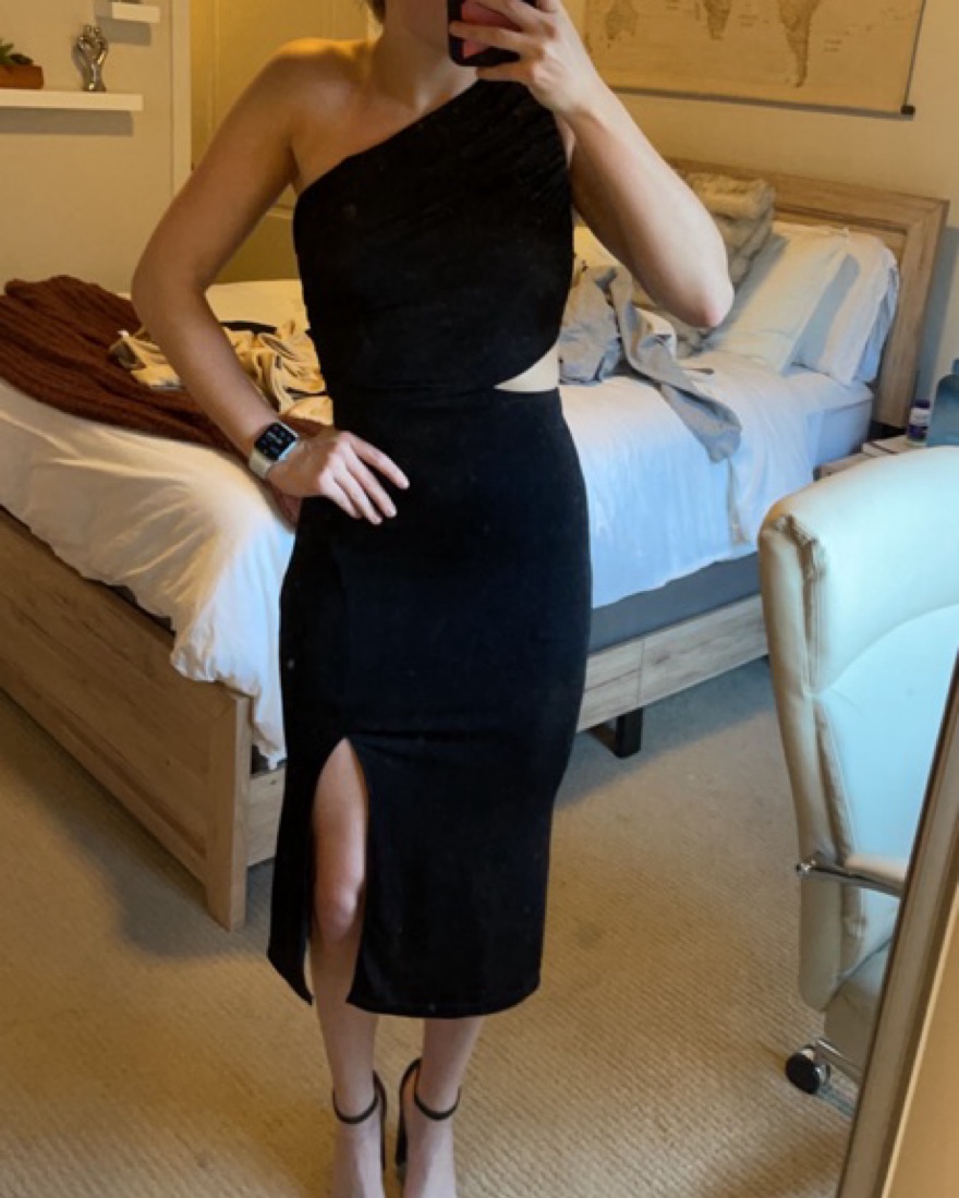 Black dress, side open, one shoulder