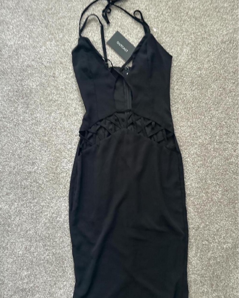 This elegant maxi dress is perfect for a night out or a special occasion. The cutout details and deep plunge neckline create a flattering and eye-catching look. Xs but fits like XXS