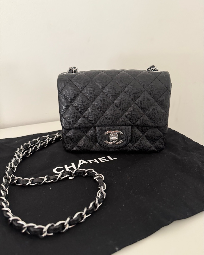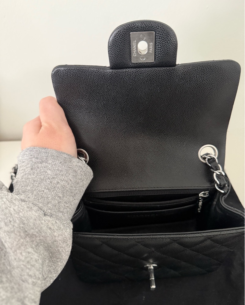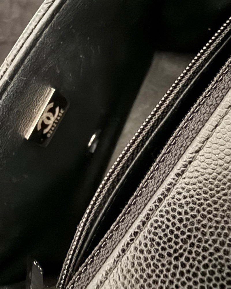 Single flap, in caviar leather with silver hardware from the 2014 cruise collection. The bag has one large compartment and a flat zippered compartment on the inside and a flat "mona lisa" pocket on the
