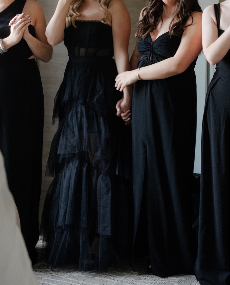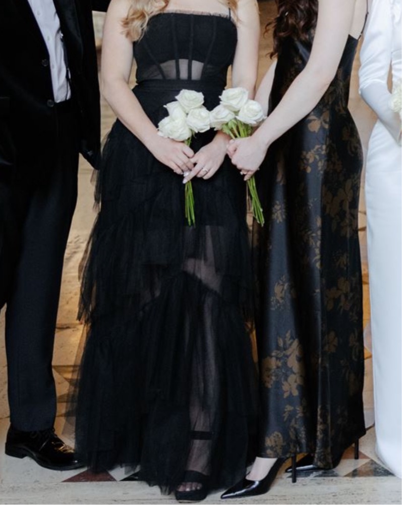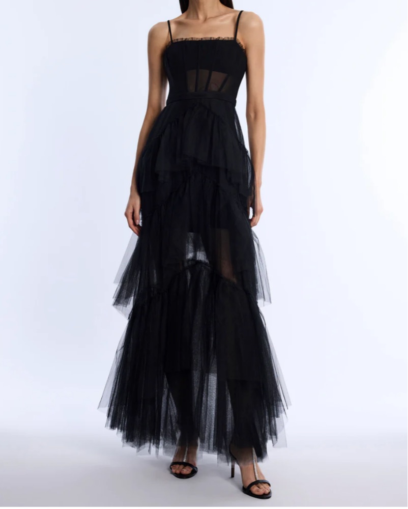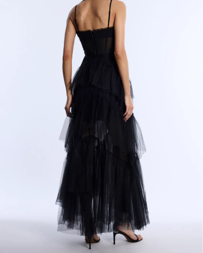 Strapless tiered gown with a soft corset bodice and cascading layers of airy tulle. Features delicate gathering at the bust and adjustable straps for added support. The dramatic skirt is structured in sculptural tiers, creating movement and volume with every step. Finished with a hidden zip closure