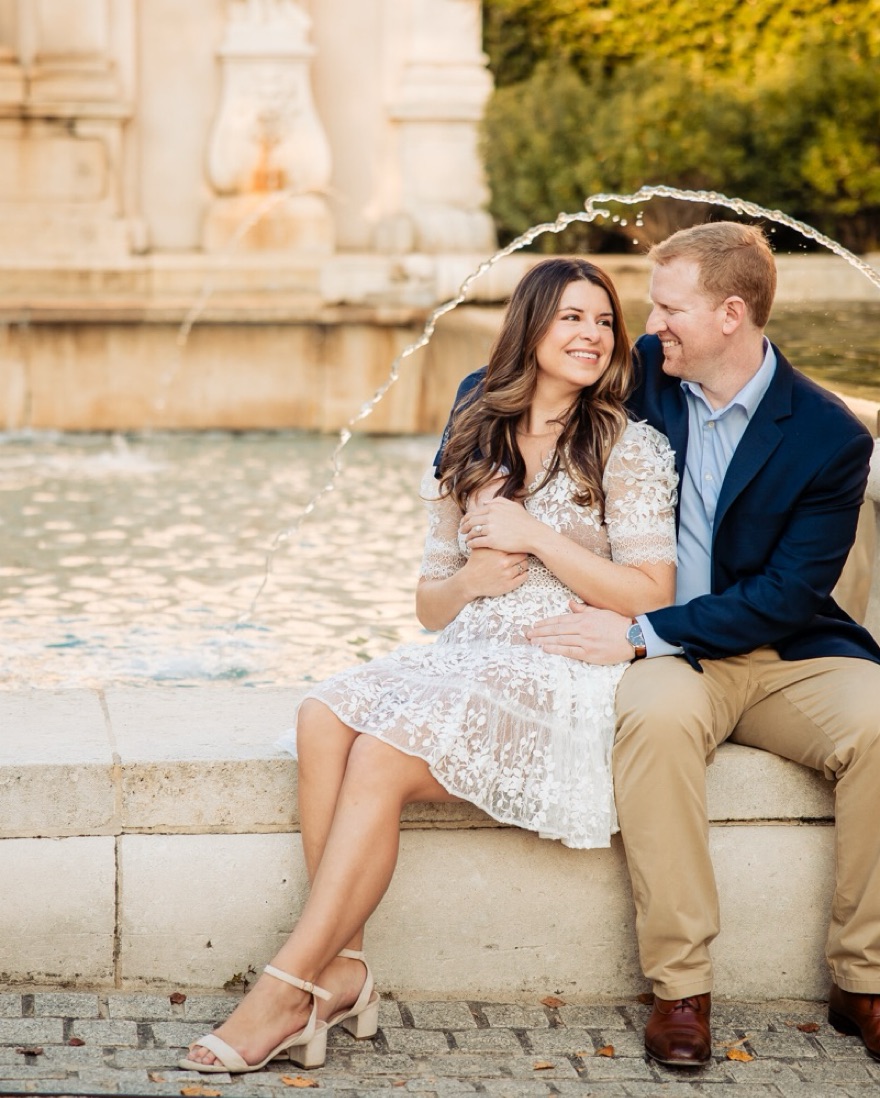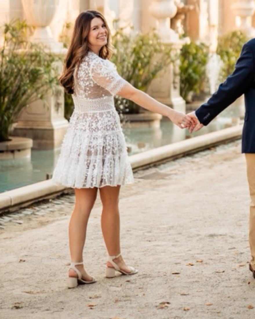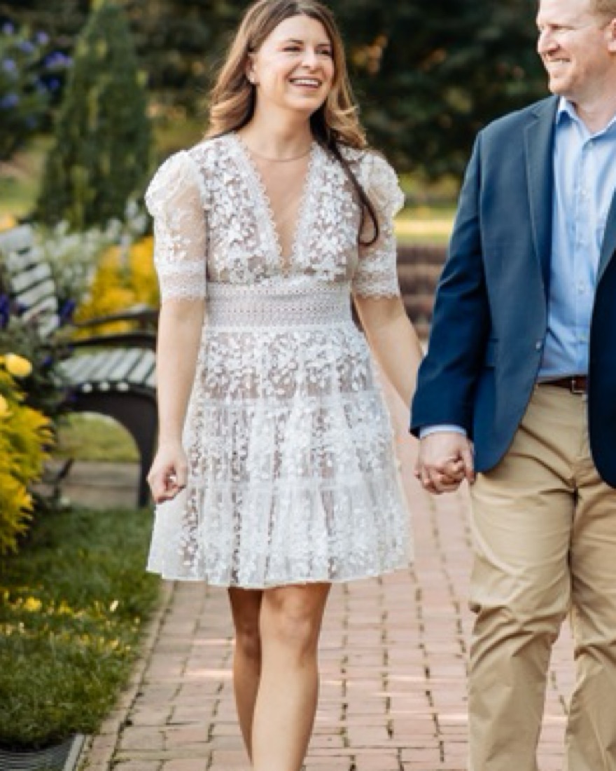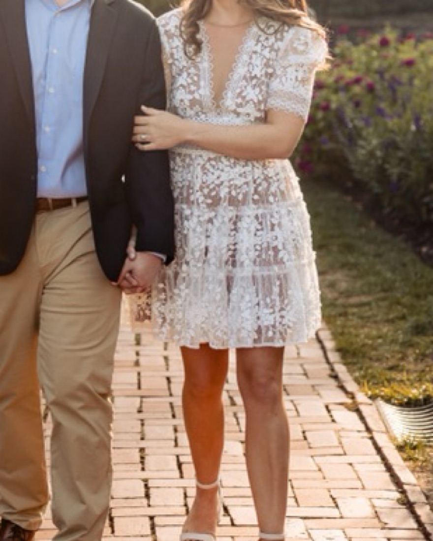 White dress worn once for engagement photos . Super cute and elegant and material is stretchy
