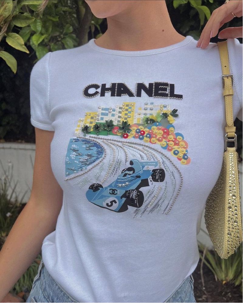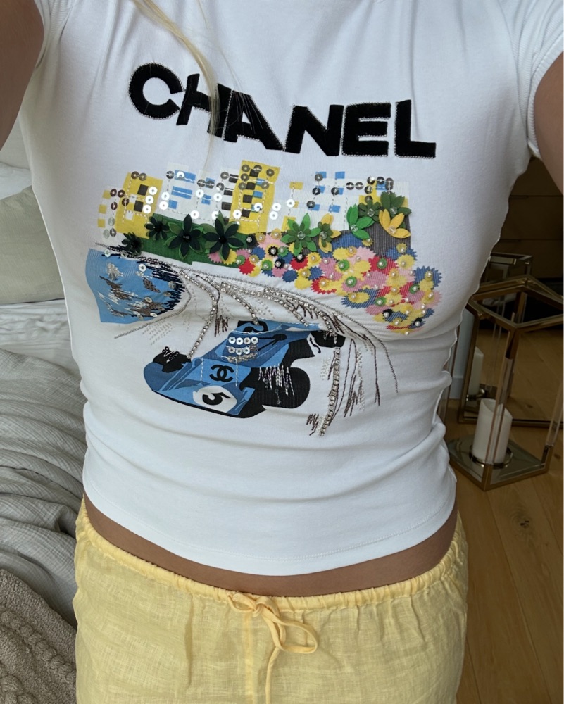 Chanel’s Cruise 22/23 Collection F1 Tshirt, size Small, perfect condition! (Please be careful with beading)