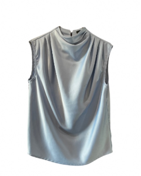 This chic sleeveless blouse with a draped neckline is perfect for a formal evening event or a night out with friends.