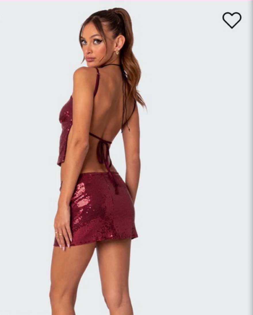 Cosmo open back sequin top from Edikted. Matching bottom also available