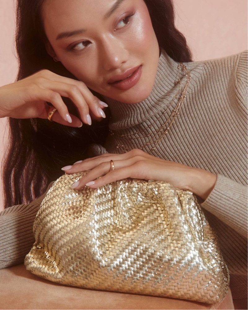 Gold, soft leather woven clutch perfect for day to night! Comes with a detachable gold chain as well.