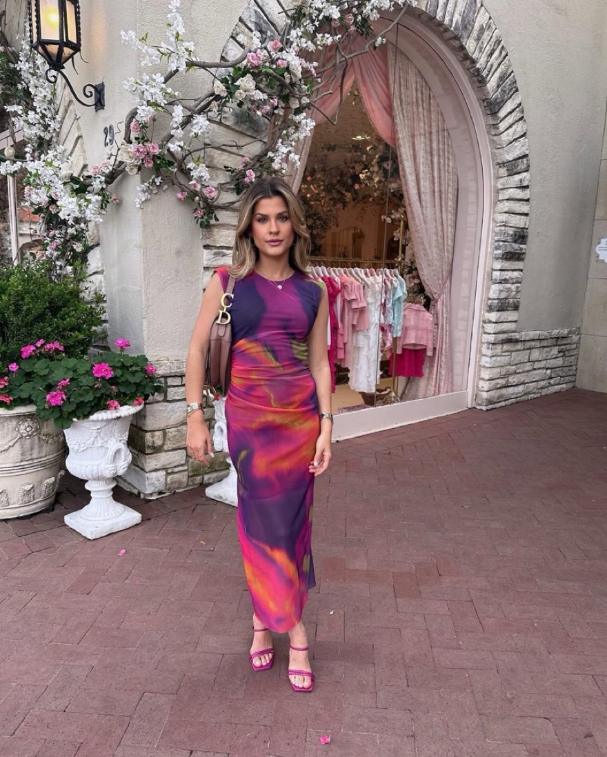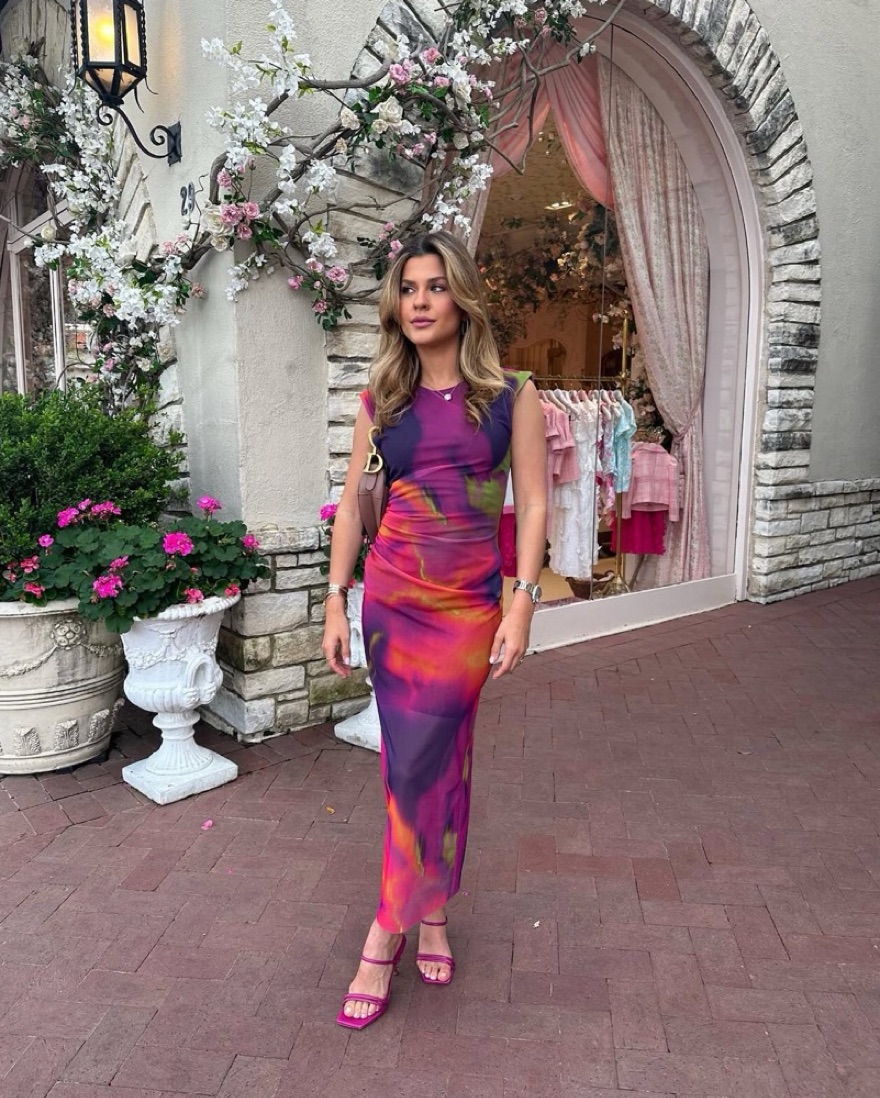 This stunning tie-dye midi dress is perfect for a fun, summer event. The vibrant colors and figure-flattering silhouette make it a stylish choice.