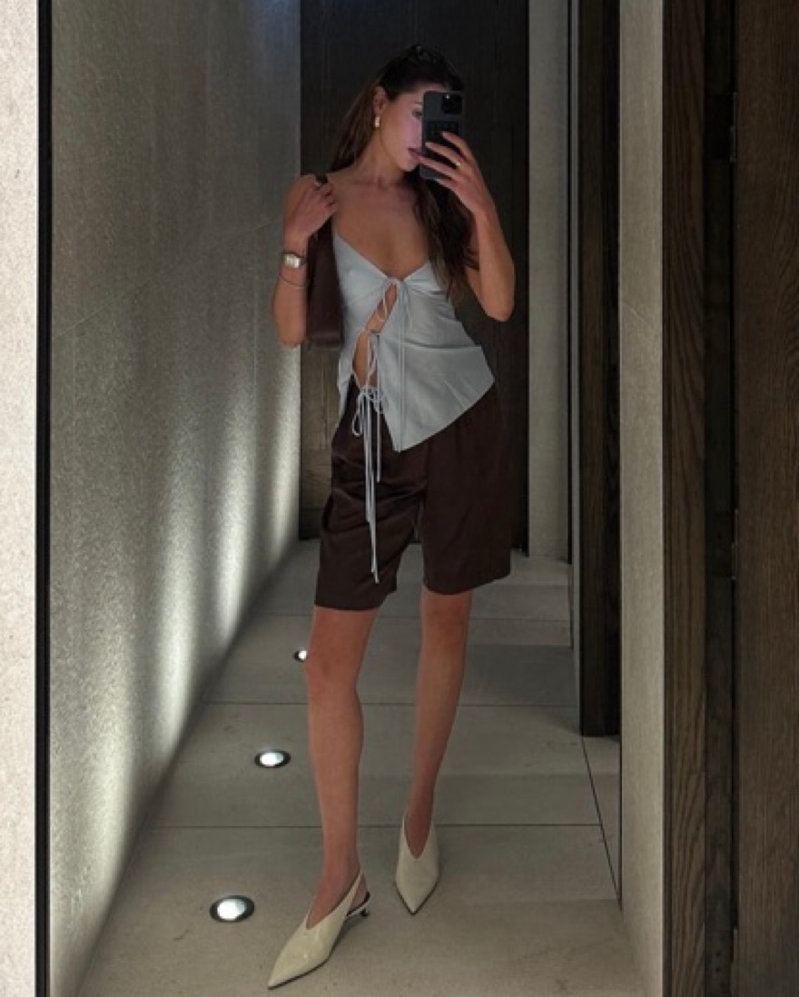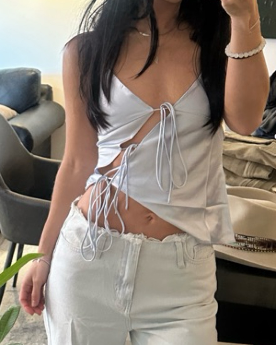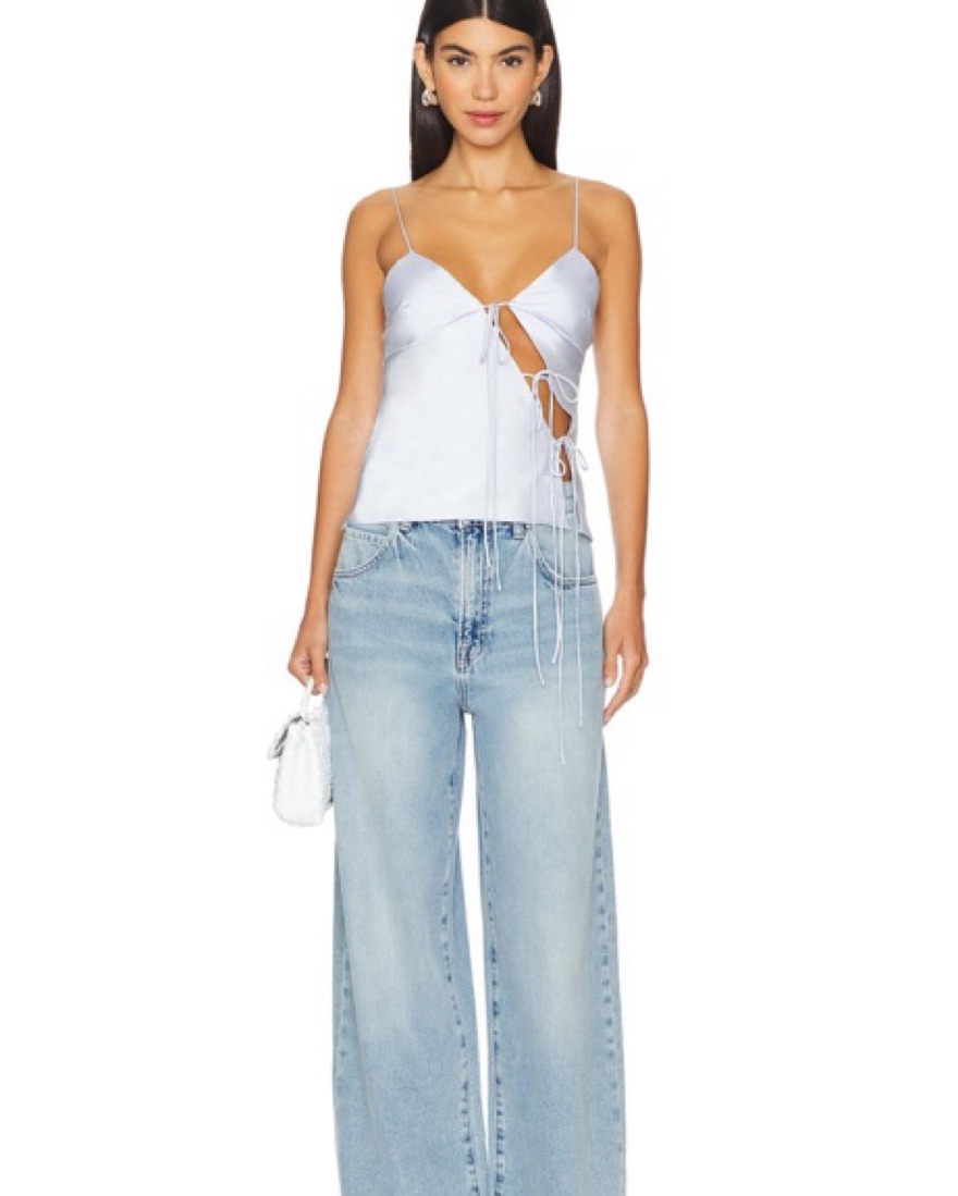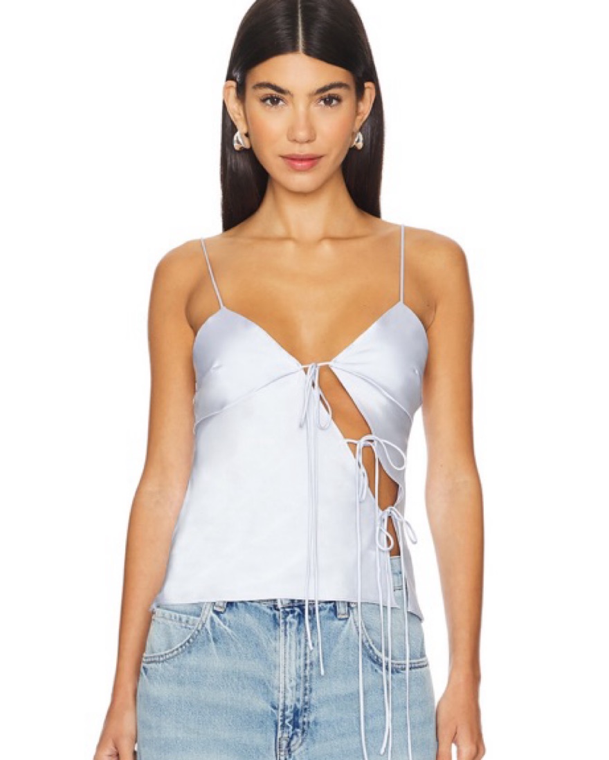 This satin cami with a flattering tie-front detail can be dressed up or down for a versatile look. Perfect for a night out, date night, party or a special occasion, the pastel blue top is so playfully chic!