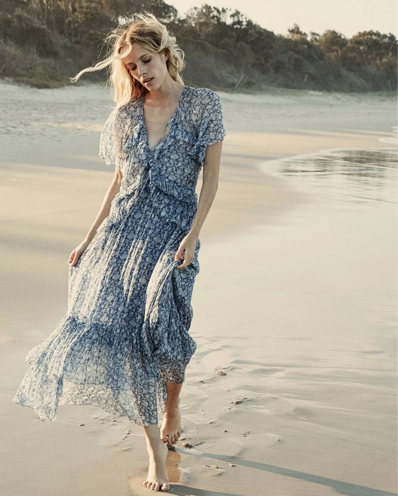 Beautiful flowy silk Doen porcelain blue maxi dress. Fluttery cap sleeves and ruffles give a bohemian and relaxed vibe. Strings at the front allow to tighten or tie as desired!