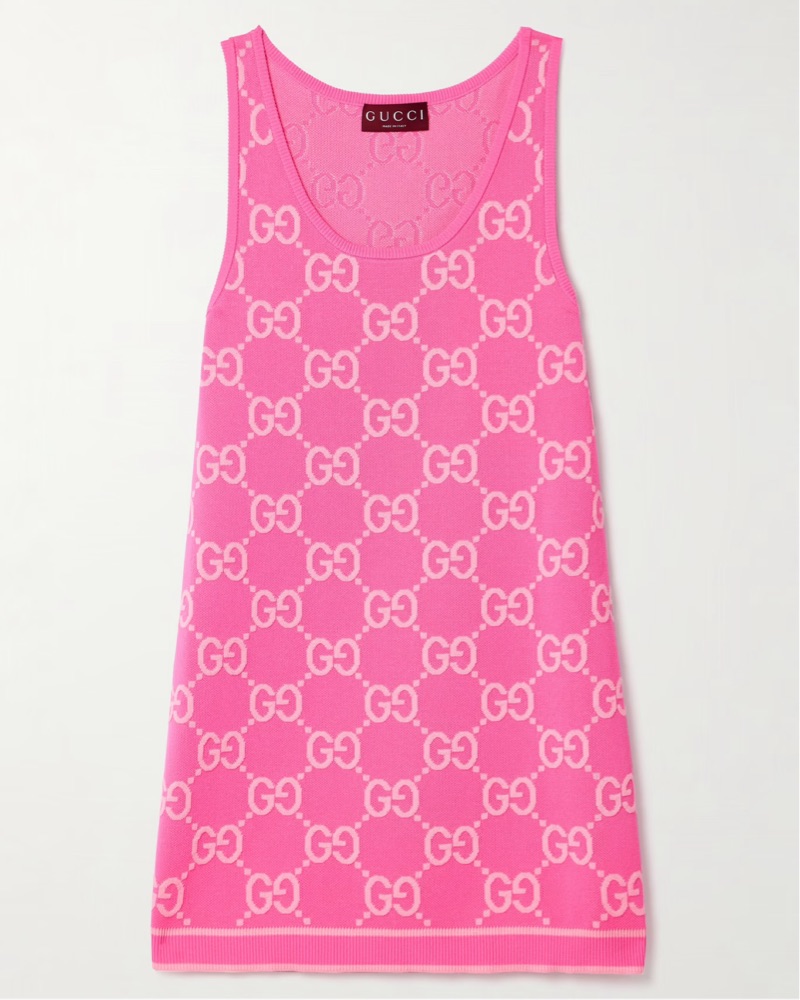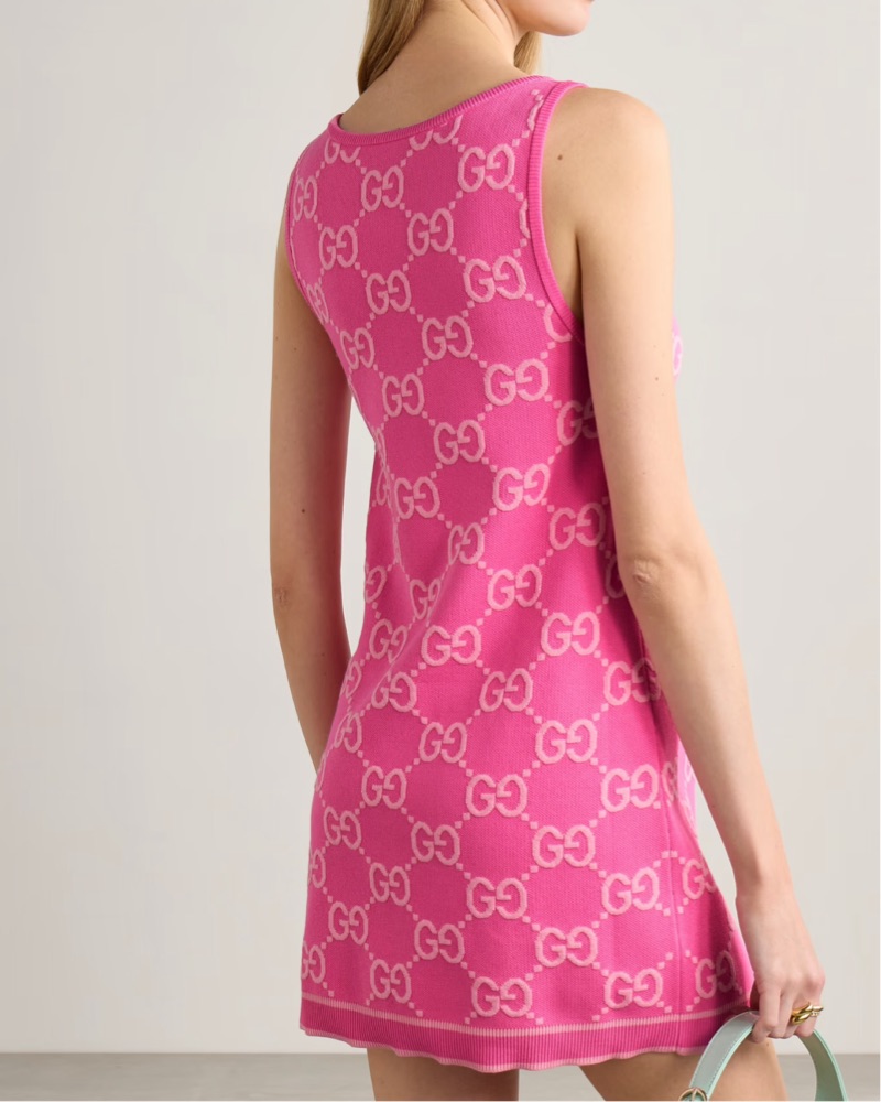 This vibrant Gucci mini dress is perfect for a fun night out. The eye-catching pink color and bold Gucci branding make this a statement piece that will turn heads.