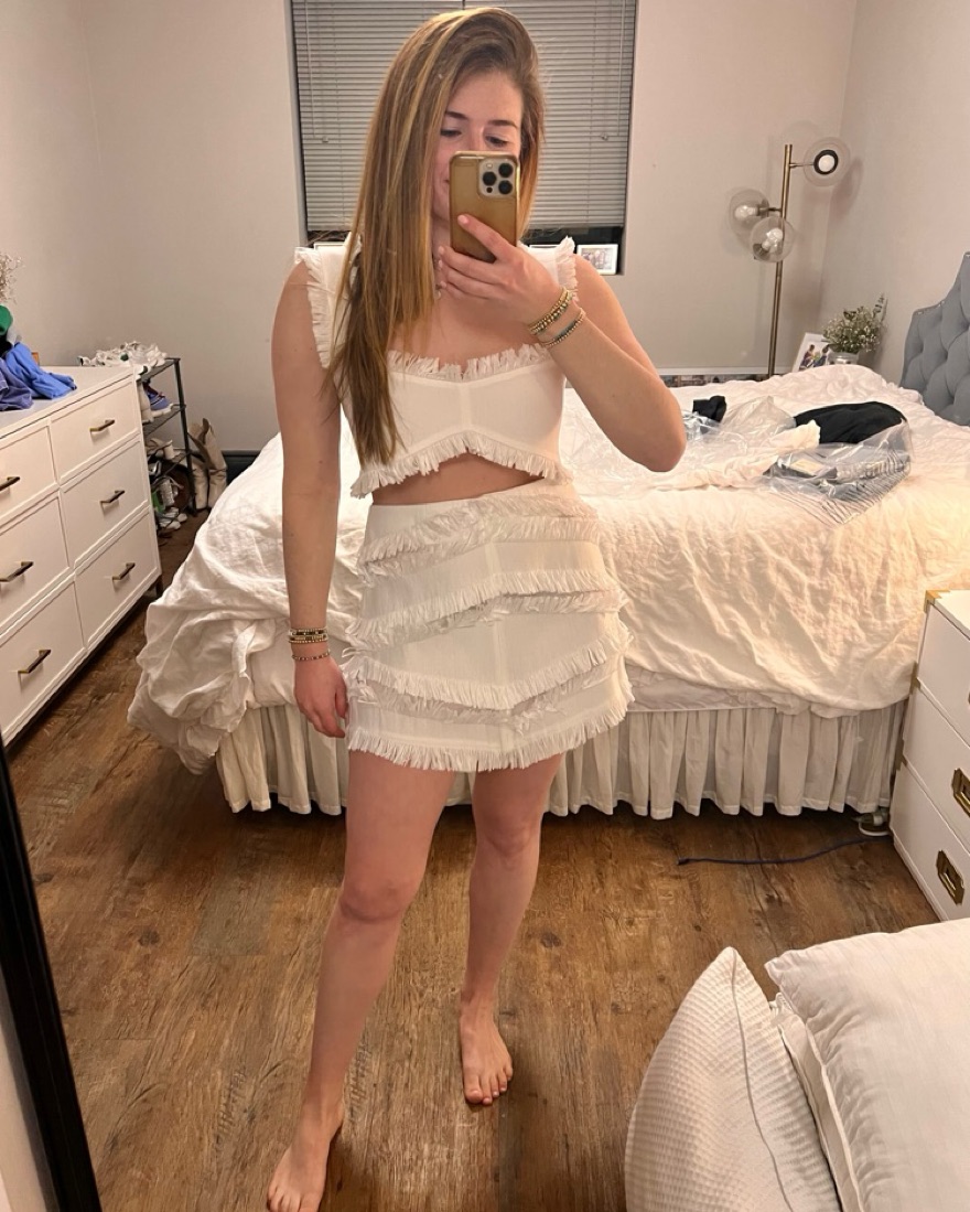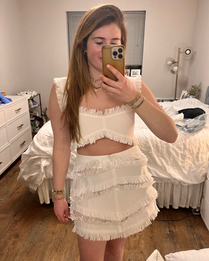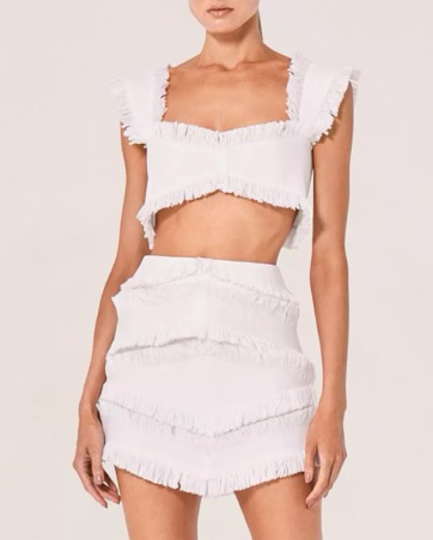 Alexis white fringe matching set. Size M. Top has hook / eye closures in back while skirt zips up. Top is quite cropped and has to be worn without a bra. The set isn’t lined, so is fairly sheer. Only worn once for a white party and in perfect condition!